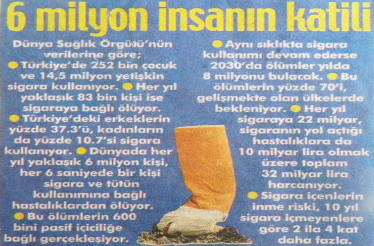 Dünyada her yıl ortalama sigara yüzünden 6 milyon insan, mezarı boyluyor. Dünya bu katilin cinayetlerine ‘Seyirci’ kalıyor. Ceza korkusu yok, elden ele dolaşıyor. Bu ‘Sinsi Katil’ dokunulmazlık zırhına bürünerek, ayrıcalıklı olduğunu bütün dünyaya ilan etmiş, hiç kimse engel olamıyor.