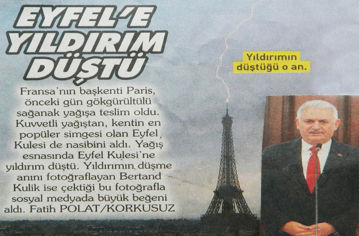 Binali YILDIRIM: “31 Mart gece yarısından itibaren sağanak şekilde ‘Oy’ yağacağı, ‘Yıldırımlar’ düşeceği tahmin edilmişti! Ancak tahminciler bizleri yanılttılar. ‘Yıldırım’lar adresi şaşırdı, İstanbul yerine Paris’e hem de Eiffel Kulesine düştü!”