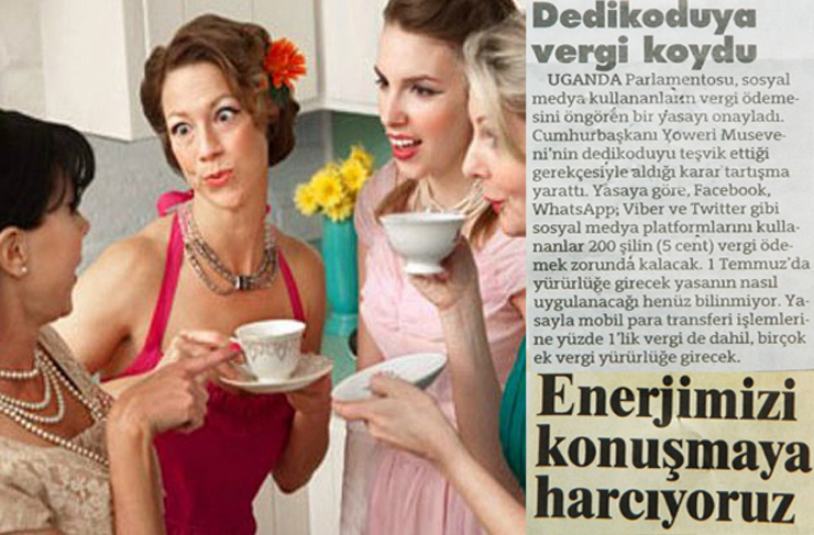 Afrika ülkelerinden Uganda’da Parlamento, sosyal medya kullananların ‘Vergi’ ödemesini öngören bir yasası onayladı. Dedikodu ‘Kirliliği’ aldı başını gidiyor. Vergi söz konusu olunca, cebe dokunacağından belki dedikoduda ‘Tasarrufa’ gidilir. Dedikoduda ısrar edenler (ÖTV) ‘Özel Tüketim Vergisi’ne de katlanıversin!