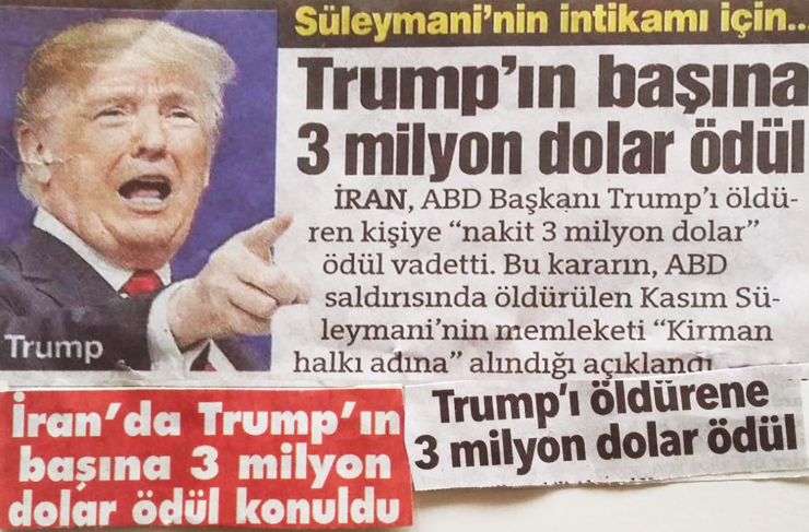 Trump (ABD Başkanı): “Benim değerim sadece 3 milyoncuk mu? Bu kadar ucuz muyum yani? Doğrusu onuruma dokundu. Ben bu hakaretin altında kalamam! Buradan ilan ediyorum, beni öldürene kelleme konulan ödülün ‘Bin Katını’ vereceğim. Vasiyetimi de şimdiden yazdırdım.”