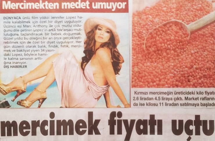 Jenifer LOPEZ (Film Yıldızı): “Günümüzde ‘Mercimeksiz’ bir hayata katlanmak gerçekten de zor. Onsuz hayat bomboş. Ancak, mercimeğin fiyatı çok pahalı! Fiyatlar almış başını gidiyor, uçuyor.  ‘Fırında Mercimekli’ yemeklere bayılıyorum ama bu gidişle ‘Mercimeği Fırında’ pişirmekten vazgeçeceğim.”