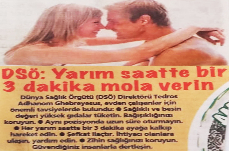 Kadın: “Sokağa çıkma yasağı işimize yaradı. Aceleye gelmeyelim. Nasıl olsa zamanımız bol! ‘Dünya Sağlık Örgütü’ (DSÖ)’nün “Sağlıklı beslenin, aynı ‘pozisyonda’ uzun süre oturmayın ve her yarım saatte bir 3 dakika ‘mola’ verin” şeklindeki bu önemli tavsiyelerine uymalıyız.”