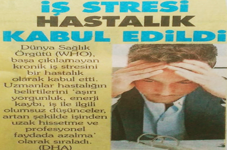 Dünya Sağlık Örgütü, başa çıkılamayan ‘Kronik’ iş stresini bir hastalık olarak kabul etti. Hastalığın belirtileri arasında ‘Aşırı yorgunluk, Enerji kaybı, iş ile ilgili olumsuz düşünceler’ yer alıyor. Dünyada bu durumda hasta olmayan kimse ‘Yok denecek’ kadar azalmış! 21. Yüzyılda ‘Ruhsal Bunalım’ Çağını yaşıyoruz. Stres, ‘Salgın Hastalık’ gibi dalga-dalga yayılıyor.
