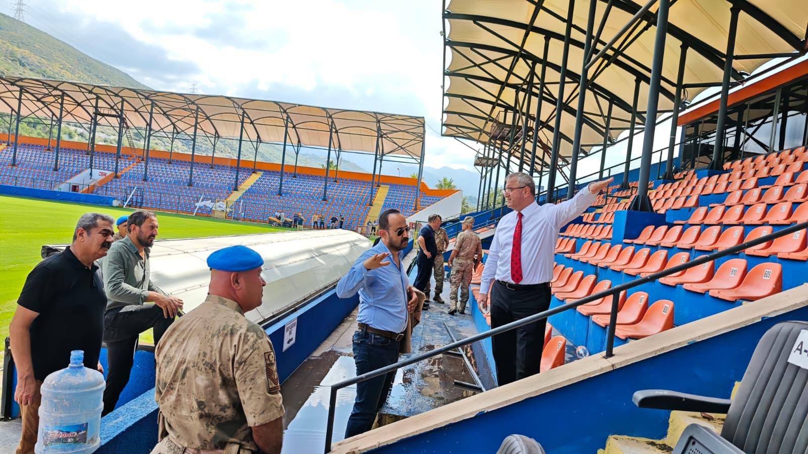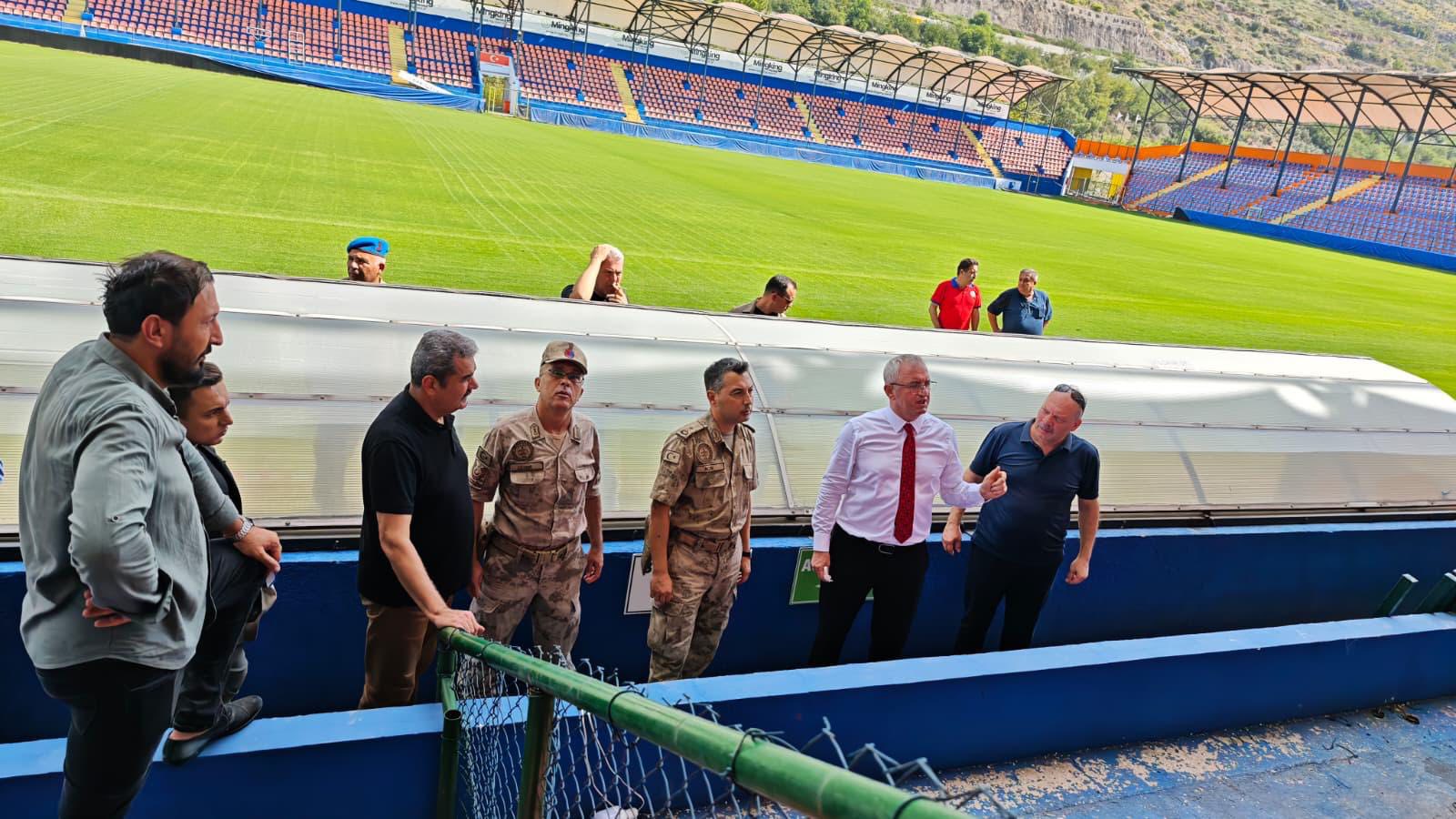 İskenderun Kaymakamı Muhammet Önder, İlçe Jandarma Komutanı J.Bnb. Mustafa Açık ve Belediye Başkan Yardımcısı Cihan Akyürek ile birlikte, İskenderun-Sarıseki Fuat Tosyalı Stadyumunda incelemelerde bulunarak yetkililerden bilgi aldı.