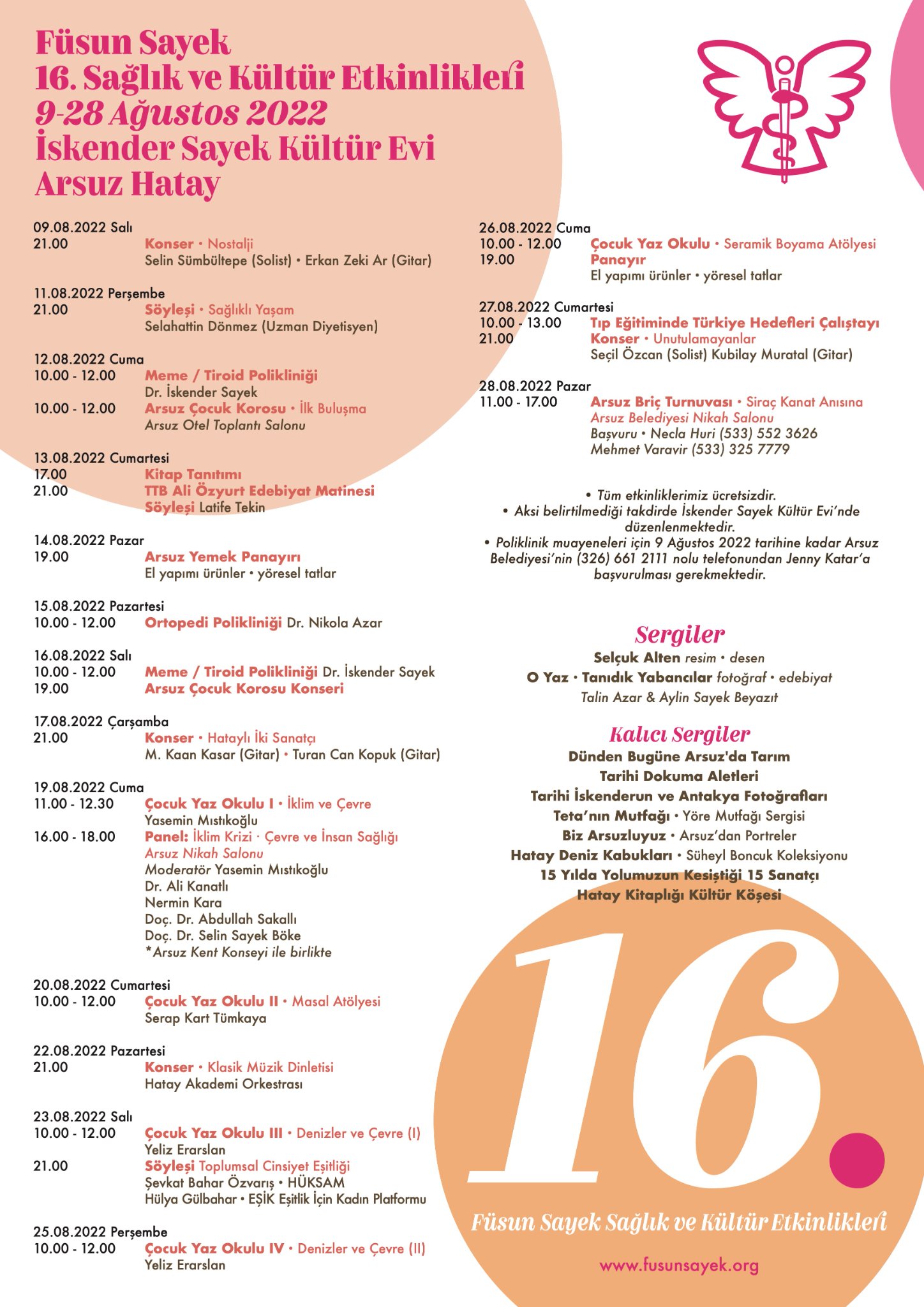 Toplumsal duyarlılık ve sosyal sorumluluk konusunda gerçekleşecek çalışmalarıyla Hatay, İskenderun ve Arsuz yörelerinde bir ilk oluşturan Füsun Sayek Sağlık ve Kültür Etkinlikleri, her yıl genişleyerek gelenekselleşmeye ve bu konuda bir örnek teşkil etmeye devam ediyor.