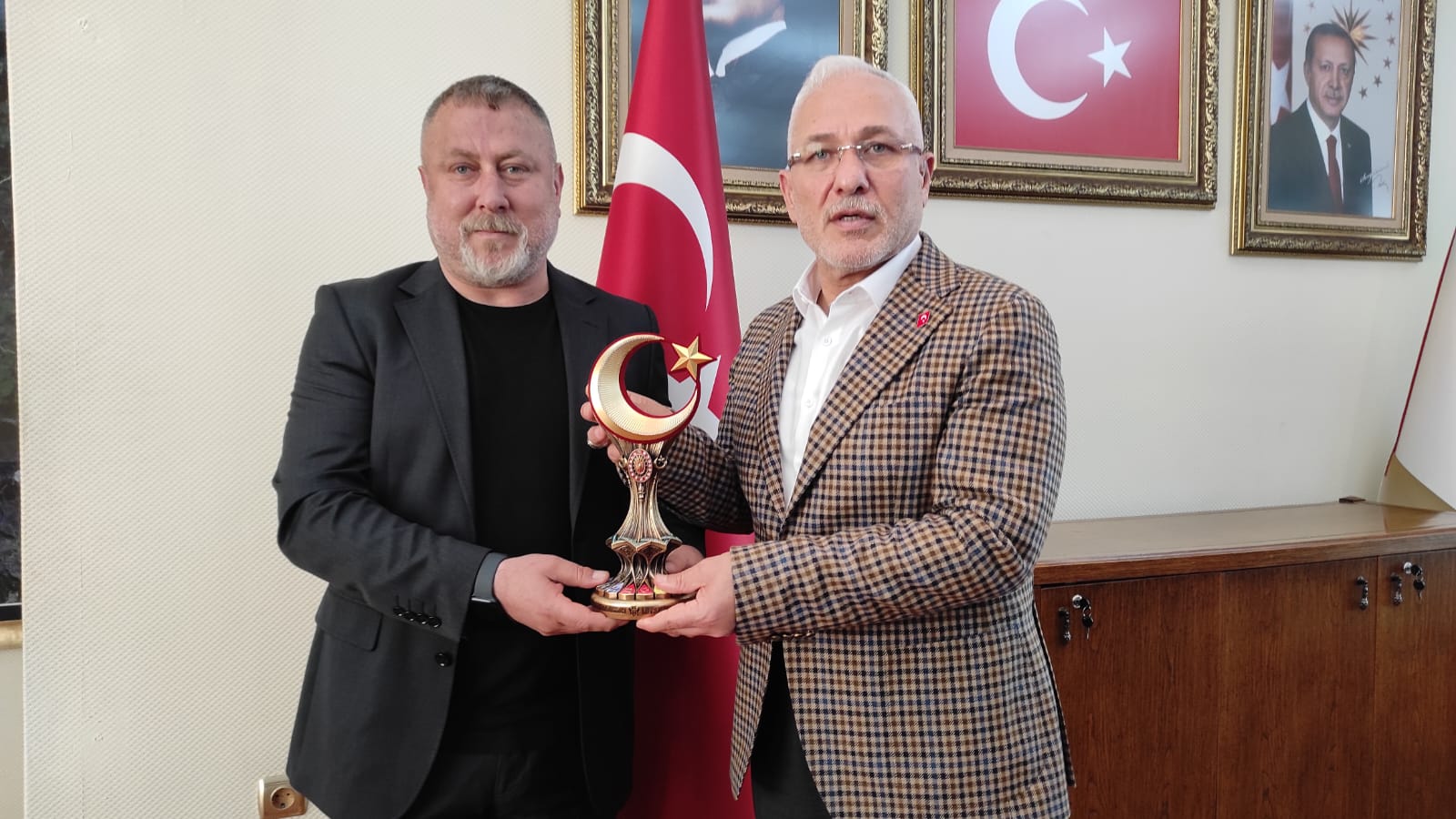 İGC Başkanı Diyap Atar, Başkan Tosyalı’ya İGC adına ay-yıldız işlemeli Şehitler Anıtı hediye etti. (Haber Merkezi)