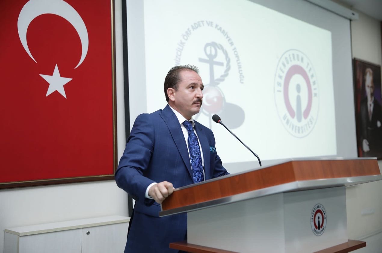 İlk mezunlarını geçtiğimiz yıl veren Deniz Ulaştırma ve İşletme Mühendisliği Bölümü öğrencilerine yönelik konuşan Dekan V. Prof. Dr. Eken; “Nice Piri Reisler, Barbaros Hayrettin Pasalar, Piyale Pasalar, yetiştiren bir ülkenin çocukları olarak dünyanın en zor ve tehlikeli mesleklerinden biri olmasına rağmen,  denizcilik mesleğini seçen ve bu uğurda karşılaşacakları bütün zorluklara göğüs germek ve denizcilik örf ve adetlerini yaşatmak için, bugün siz değerli katılımcıların önünde yemin eden bütün kardeşlerimin yemin törenlerinin hayırlı uğurlu olmasını diliyorum.