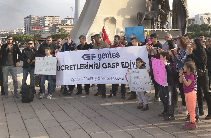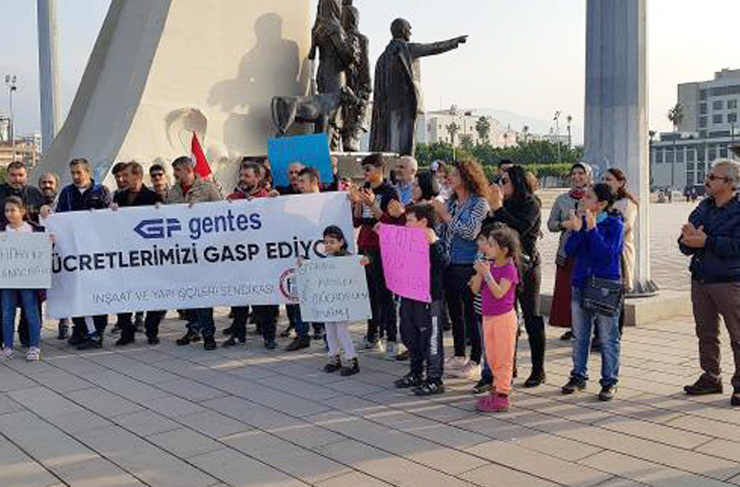 İskenderun’da yapılan eylemde konuşan İyi-Sen Genel Başkanı Ali Öztutan; “İnşaat işçisini köle olarak gören ve işçilerin aylardır ücretlerini ödemeyerek işçileri ve işçilerin ailelerini yoksulluğa mahkûm eden Gentes patronu İzzet Ekmekçibaşı’na memleketi İskenderun’dan sesleniyorum. Gentes işçisinin emeğini ve alın terini ödeyeceksin. Keyfine göre hareket edemezsin tüm birikmiş ücretler ödenene kadar inşaat işçisini karşında bulacaksın.