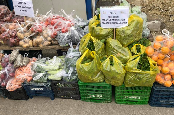 Koronavirüs salgını nedeniyle Belen ilçesinde kurulan semt pazarında, maddi durumu yetersiz vatandaşların ücretsiz olarak alabilecekleri Belen Belediyesi sebze, meyve tezgahı, sosyal sorumluluk proje kapsamında hizmete girdi.