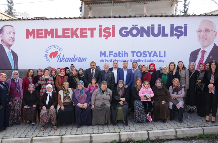 Cumhur İttifakı Ak Parti İskenderun Belediye Başkan Adayı Fatih Tosyalı ise konuşmasında, “Hepimizin burada yaşamaktan mutlu olduğu, hepimizin gururla ‘Ben İskenderunluyum’ dediği bir ilçe hayal ediyorum. Buna 45 mahallemiz dahil. Çocukların rahatça eğlenebileceği kulüpler, Kadın eğitim merkezleri, sosyal tesisler, denizle bulaşacağınız alanların olduğu, var olan yeşil alanlara yeni alanlar ilave ettiğimiz, sosyal, kültürel faaliyetlerle öne çıkmış, kültür belediyeciliğini daha da yukarıya taşımış, ilçesiyle hemhal olmuş, derdiyle dertlenen bir İskenderun hayal ediyoruz. Hep birlikte başaracağız.