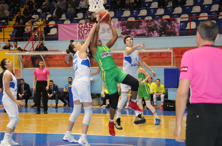 Sami Özel, Fatih Güler ve Umut Özgün Ergün hakem üçlüsünün yönettiği müsabakanın başlangıcından itibaren saha avantajını kullanarak sayı elde eden Hatay’ın Melekleri, maçın ilk çeyreğini 21-16 sayıyla önde tamamladı. İkinci çeyrekte de etkili oyununu sürdüren temsilcimiz, rakibiyle arasındaki farkı giderek açarak soyunma odasına 46-37 üstünlükle girdi.