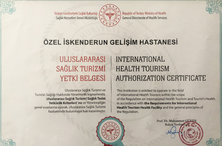 Sağlık sektöründe önemli değişimlere ve ilklere imza atmaya devam eden İskenderun Gelişim Hastanesi, Hatay’da ‘Sağlık Turizmi Yetki Belgesi’ alan tek hastane oldu.