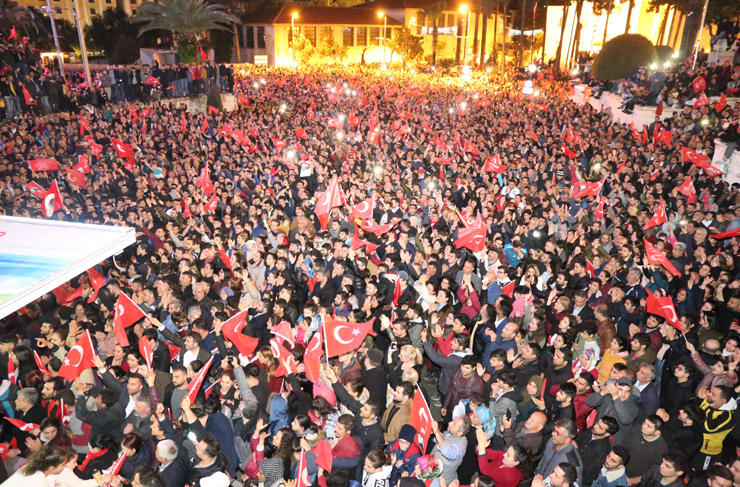 Alkışlar eşliğinde kutlama alanına gelen Başkan Savaş; “Bugün Hatay ülkesine sarıldı bayrağına sarıldı şehrine sarıldı, birliğine sarıldı. Bir damla olarak yola çıktık. Önce göl sonra deniz şimdi ise okyanus olduk. Bugün bizim bayram günümüz. Bugün bize yakışır bir şekilde bayramımızı kutlayacağız. Bugün Hatay’da demokrasi kazandı. Hepimiz kazandık. Bugün en önemli şey Hatay’da sevgi kazandı, huzur kazandı, birliktelik kazandı. Hepinizden Allah razı olsun” şeklinde konuşarak hemşerilerine teşekkür etti.