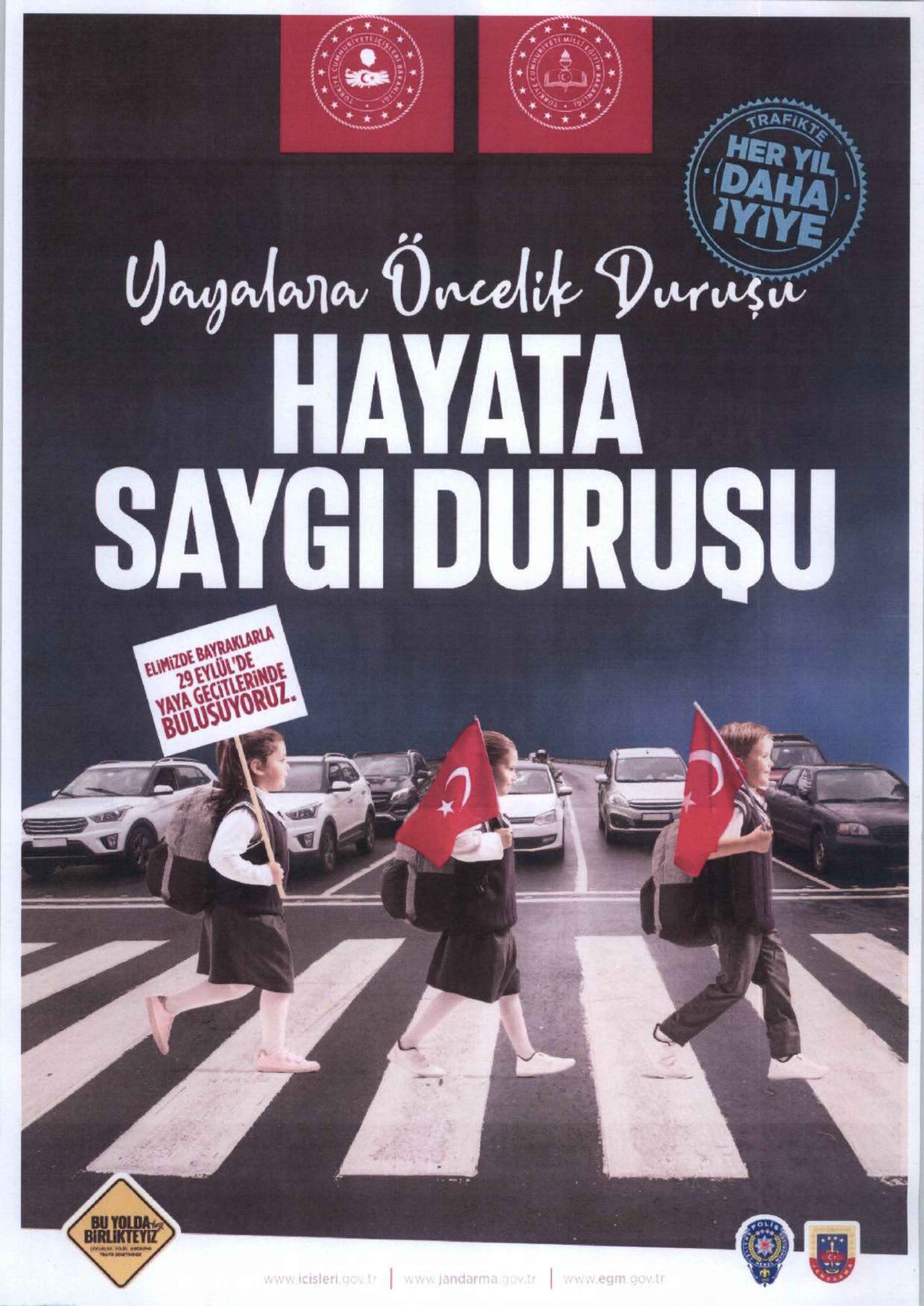 2022 yılı süresince trafikte yaya önceliği konusunda farkındalığı artırmak, yaya ve okul geçitlerinde sürücülerin uyarılarak dikkatlerini daha üst düzeye çıkartmak, yayalara öncelik konusunda doğru sürücülük davranışı kazandırmak ve bu bölgelerde yavaşlayarak yayalara ilk geçiş hakkını vermelerini sağlamak için “Yayalara Öncelik Duruşu, HAYATA SAYGI DURUŞU” sloganıyla 29 Eylül 2022 Perşembe günü (bugün) 11.00-14.00 saatleri arasında tüm illerimizde eş zamanlı olarak Kaymakamlar, İl Emniyet Müdürleri, İl Jandarma Komutanları ve İl Milli Eğitim Müdürlerimiz başta olmak üzere kurum yöneticisi ve temsilcilerinin katılımıyla devletin tüm unsurları ile farkındalık eyleminde bulunduğunu göstermek amacıyla belirlenecek olan okullarda ve yaya/okul geçitlerinde kampanya etkinlikleri düzenlenecek. (Haber Merkezi)