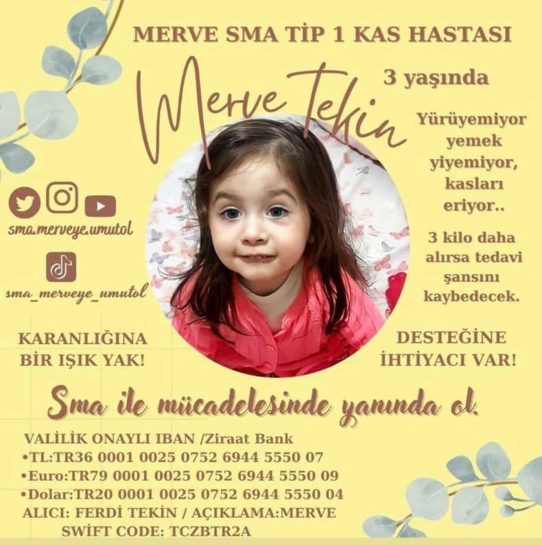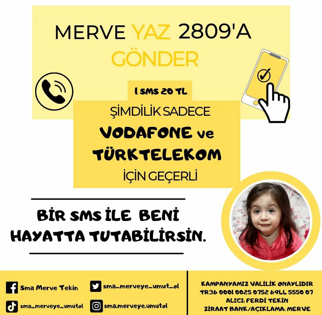 Merve Tekin, siz hayırseverlerin desteğini bekliyor. Siz de karanlığa bir ışık yakın ve SMA ile mücadelesinde onun yanında olun… Sadece bir SMS ile veya Merve’nin adına açılan Valilik Onaylı banka hesabına yapacağınız yardımla onun bu mücadelesine yardımcı olabilir ve onu hayatta tutabilirsiniz. Haydi şimdi! (Haber: İlyas Edip TERBİYELİ)