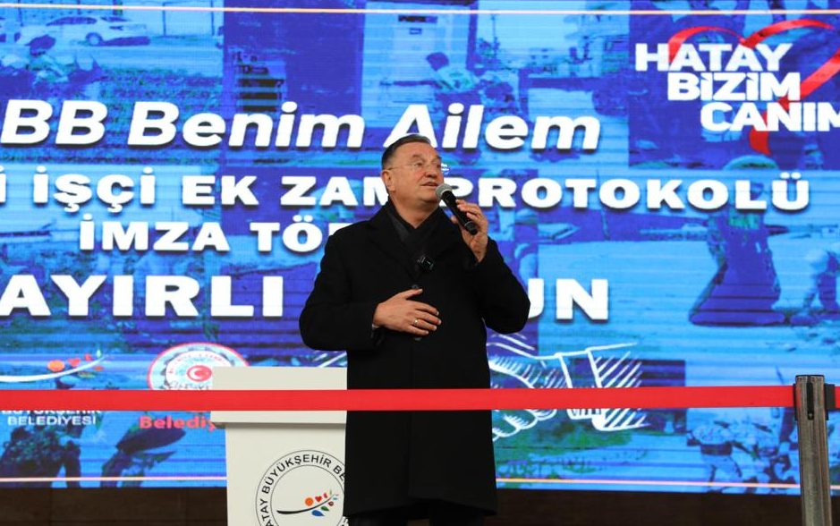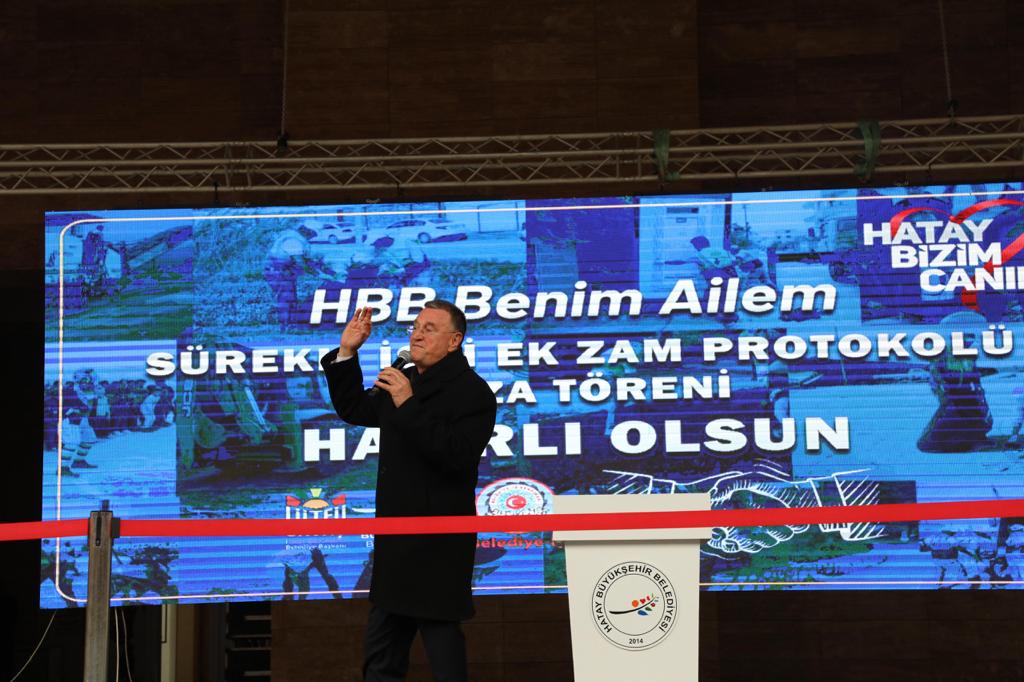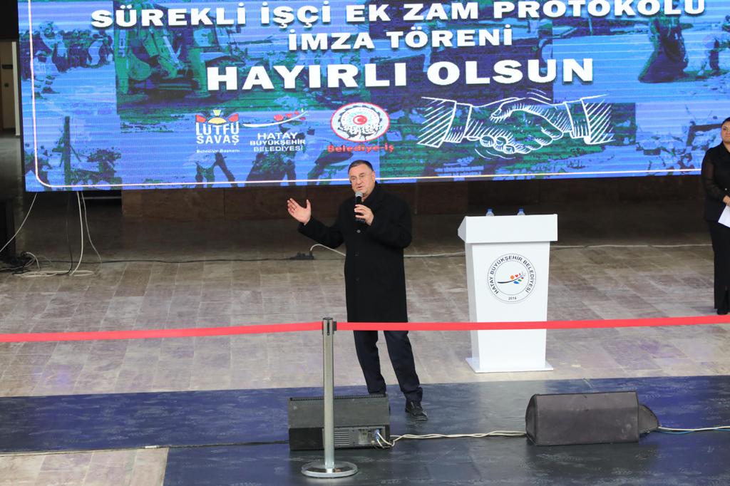 Hatay Büyükşehir Belediyesi’nde çalışan personel için ‘Sürekli İşçi Ek Zam Protokolü’ imza töreni gerçekleşti. HBB ve Belediye-İş arasında gerçekleştirilen imza törenine katılan HBB Başkanı Doç. Dr. Lütfü Savaş, personel tarafından yoğun ilgi ile karşılandı.
