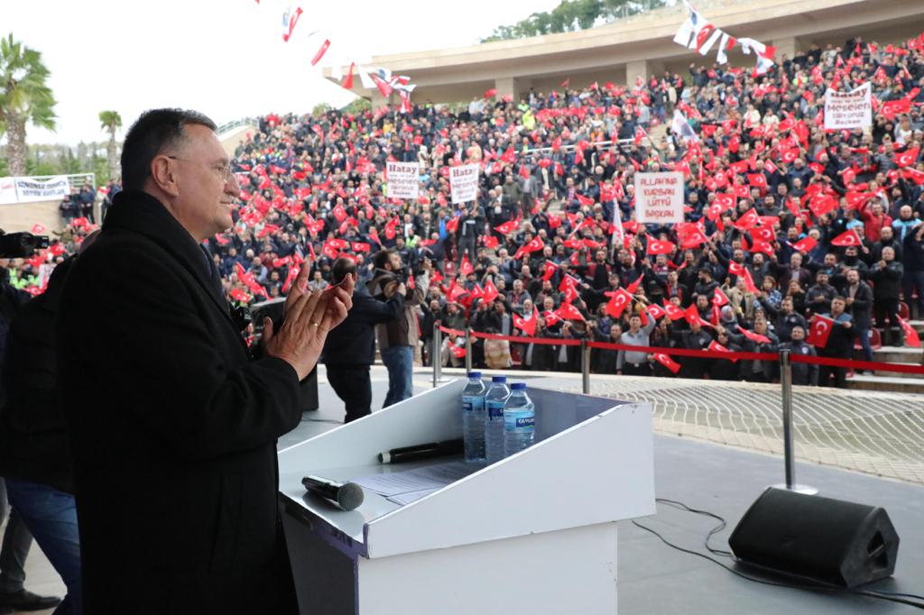 Hatay’ın,  ataların ve Gazi Mustafa Kemal Atatürk’ün emaneti olduğunu kaydeden Savaş; “Gazi Mustafa Kemal Atatürk ebediyete intikal etmeden önce Hatay’ı şahsi meselesi addetmiş. Biz de Hatay’ımıza sahip çıktık, çıkmaya da devam edeceğiz. Sizlerin neler çektiğini biliyorum. Bundan sonraki süreçte hep beraber sizlerle şehrimize sahip çıkmaya devam edeceğiz. Pırlanta gibi olan şehrimiz bizlere atamızın yadigârı onu kimseye vermeyiz. 3 dönemdir belediye başkanıyım. Şehrimizi hiç kimsenin eline bırakmayacağız. Haklı meselemizi feryadımızı biz bırakırsak kimse paylaşmayacak. Korkmuyoruz, çekinmiyoruz ve mücadelemiz devam ediyor. Hepinizle birlikte şehrimizi yeniden ayağa kaldıracağız” diye konuştu.