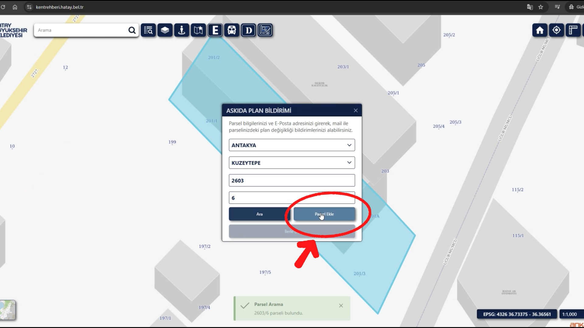 Kent Rehberi’nin https://kentrehberi.hatay.bel.tr adlı web sitesi ve mobil uygulaması üzerinden “Askıda Planlar” butonuna tıklayan vatandaşlar, parsel bilgilerini sisteme kolayca ekleyebiliyor. “Parsel Ekle” ve ardından “İlerle” butonlarıyla ad, soyad ve e-posta adresi girilerek hem mevcut hem de gelecekteki imar planı değişikliklerinden anlık bildirimlerle haberdar olunabiliyor.