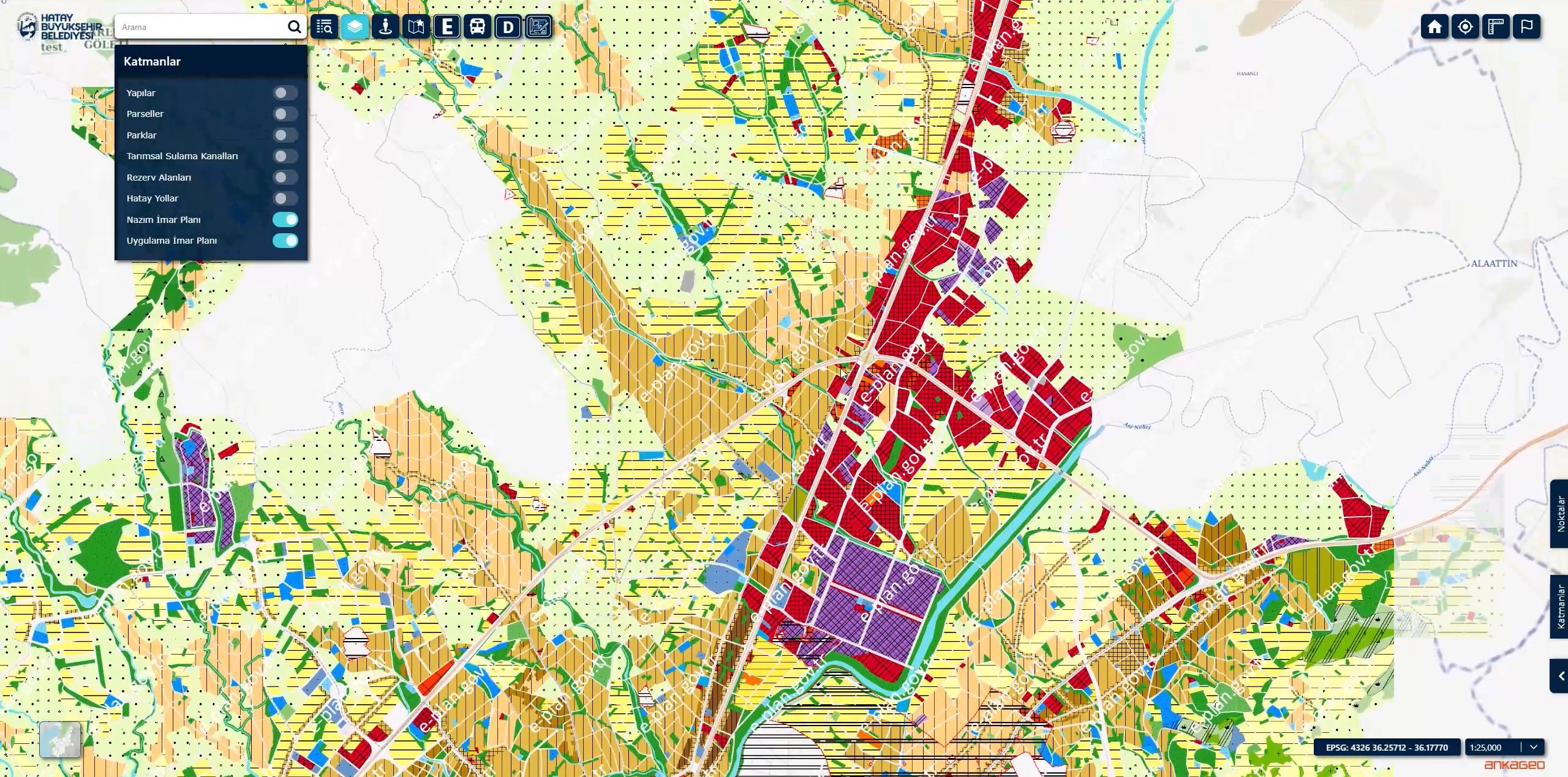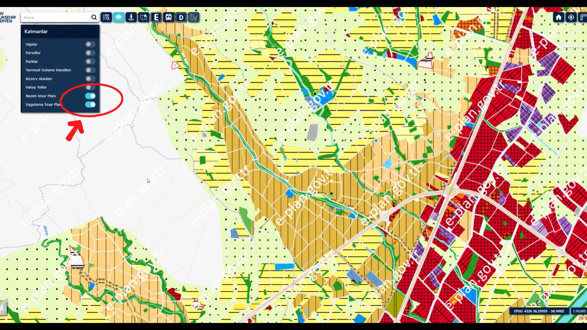İmar planlarını incelemek isteyen kullanıcılar “Katmanlar” butonuna tıklayarak Nazım İmar Planı ve Uygulama İmar Planı bilgilerine erişebiliyor.