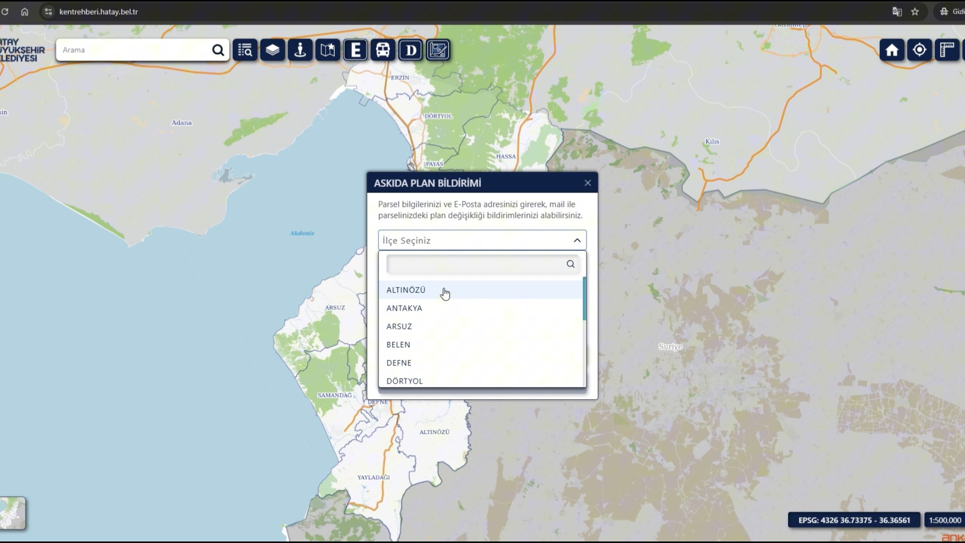 Kent Rehberi’nin https://kentrehberi.hatay.bel.tr adlı web sitesi ve mobil uygulaması üzerinden “Askıda Planlar” butonuna tıklayan vatandaşlar, parsel bilgilerini sisteme kolayca ekleyebiliyor. “Parsel Ekle” ve ardından “İlerle” butonlarıyla ad, soyad ve e-posta adresi girilerek hem mevcut hem de gelecekteki imar planı değişikliklerinden anlık bildirimlerle haberdar olunabiliyor.