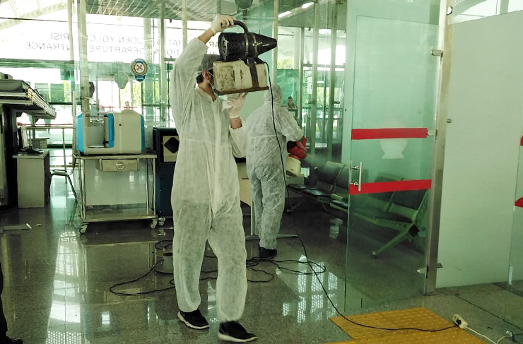 Hatay Büyükşehir Belediyesi(HBB), salgın hastalık riskine karşı örnek bir mücadele veriyor. Okullar, toplu taşıma araçları, resmi kurum ve kuruluşlar ile kendi bünyesindeki hizmet binalarında dezenfeksiyon seferberliği başlatan HBB ekipleri, bu kez de Hatay Havaalanı’nda kapsamlı bir dezenfeksiyon gerçekleştirdi. Binlerce yolcunun geliş-gidiş yaptığı havaalanında sterilizasyon önlemi alan HBB ekipleri, dezenfeksiyon çalışmalarının il genelinde devam edeceğini duyurdu. (Haber Merkezi)
