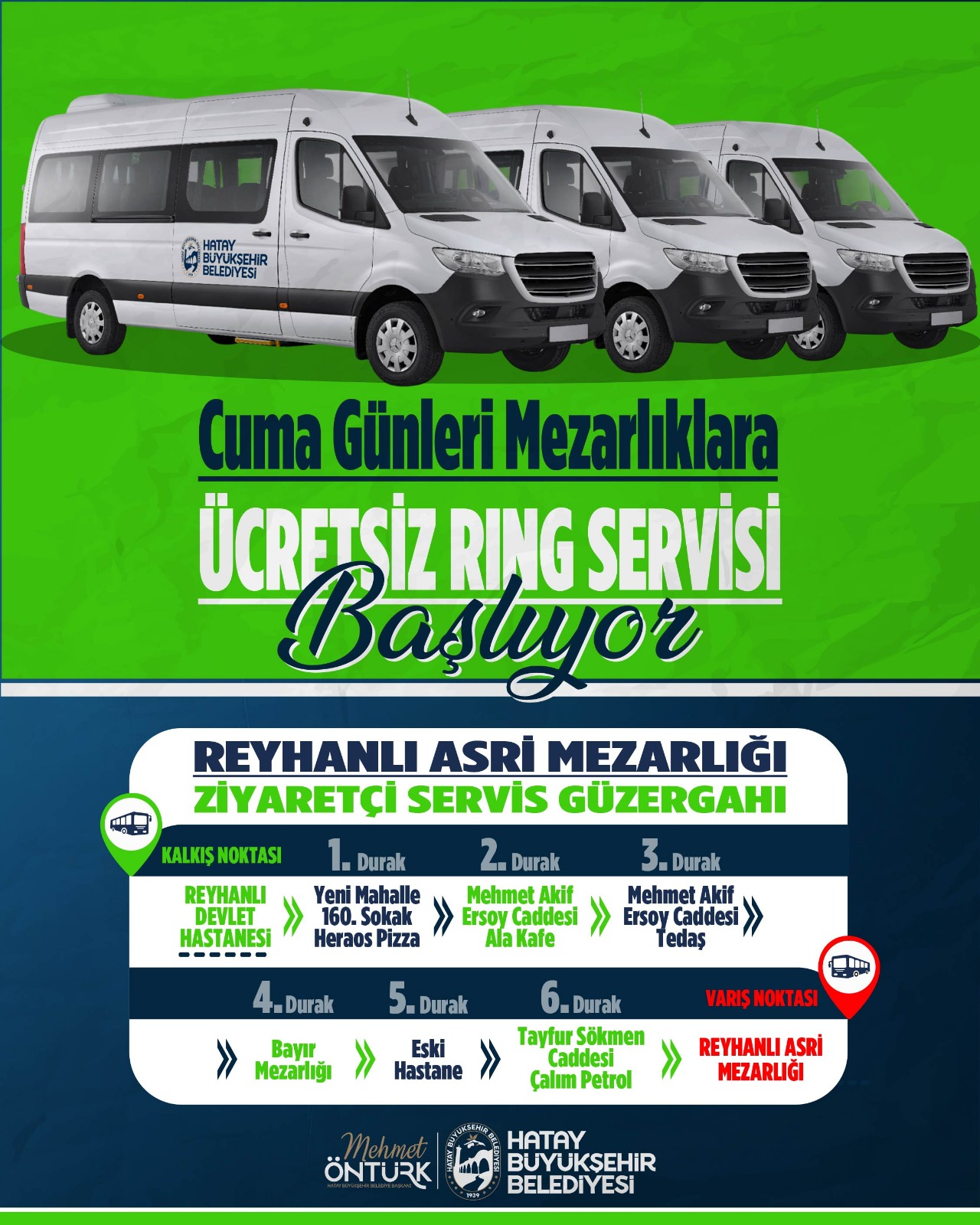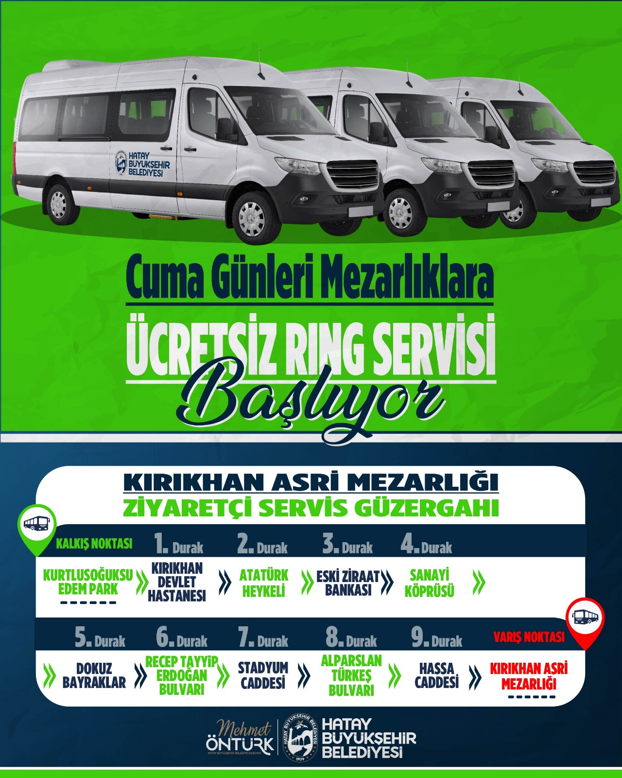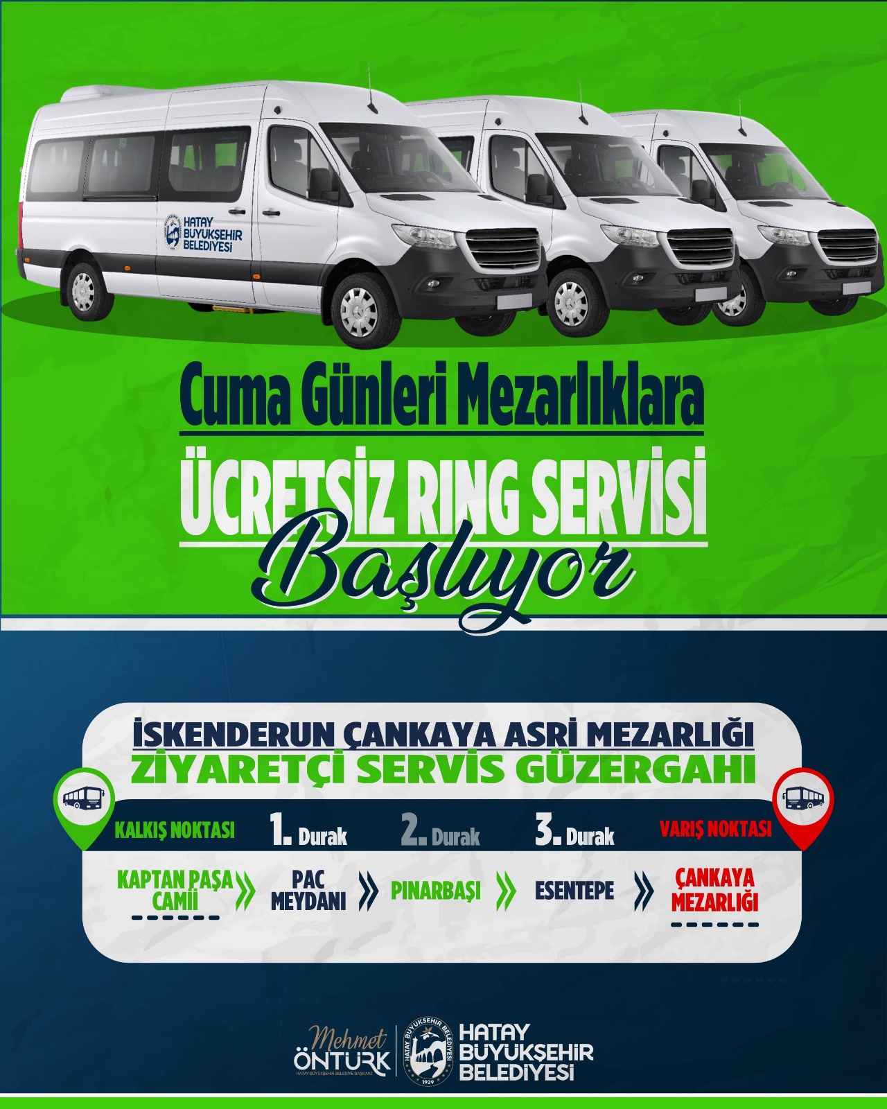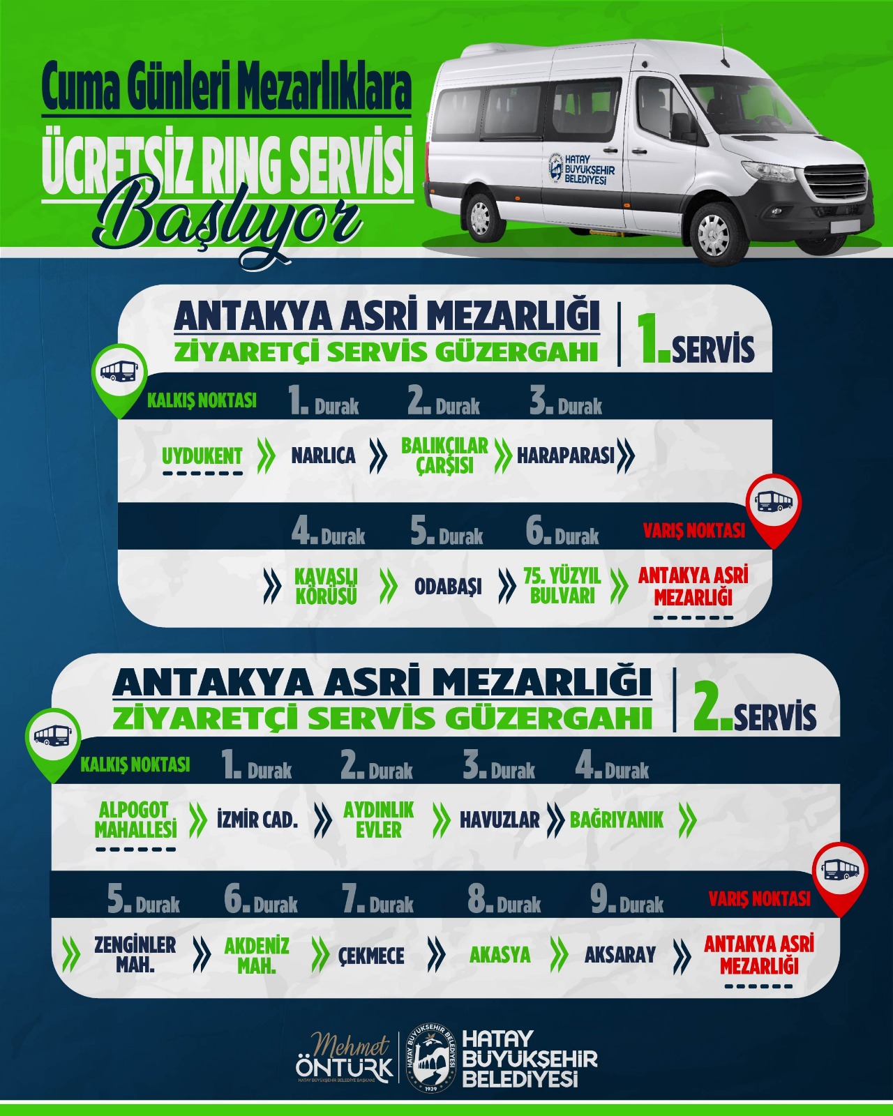Arsuz, İskenderun, Samandağ, Antakya, Dörtyol, Kırıkhan ve Reyhanlı’da her cuma günü 09.00 ile 15.00 saatleri arasında asri mezarlık ziyaret araçları ücretsiz olarak vatandaşlara hizmet verecek.