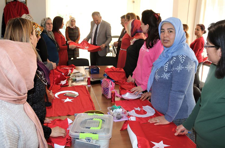 Bu kapsamda, İlçemiz Numune Mahallesindeki Belediye Kültür Evine ziyaret gerçekleştiren İlçe Kaymakamı İskender Yönden, Halk Eğitim Merkezi Müdürlüğünce uygulanan dikiş kurslarına katılan ve hünerli elleriyle şanlı Türk bayrağımızı diken asil ruhlu kadınlarımızı canı gönülden tebrik etti. (Haber Merkezi)