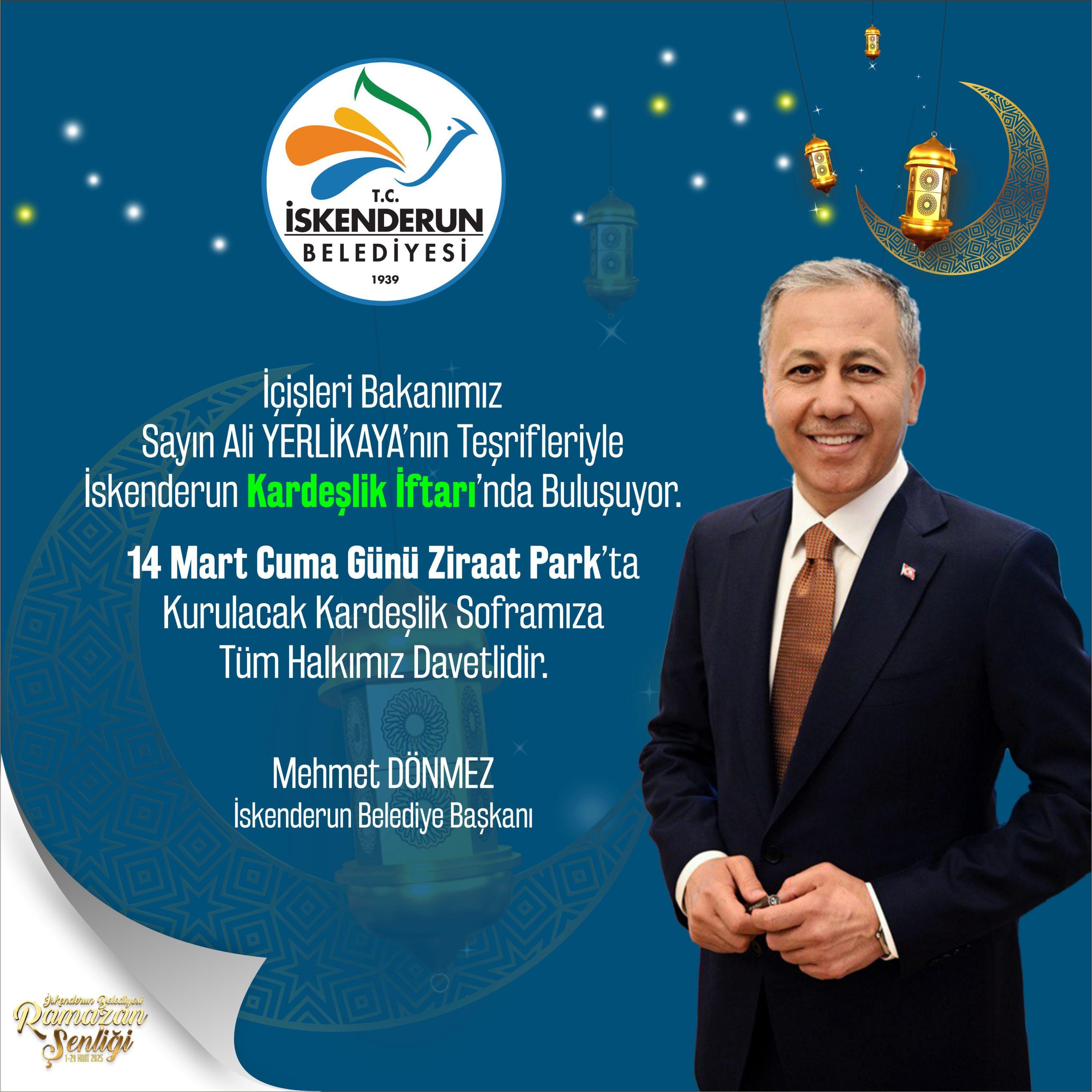 Konuyla ilgili İskenderun Belediye Başkanı Mehmet Dönmez; “İçişleri Bakanımız Sayın Ali Yerlikaya’nın teşrifleriyle İskenderun Kardeşlik İftarında buluşuyor. 14 Mart Cuma günü Ziraat Park’ta kurulacak Kardeşlik Soframıza tüm halkımız davetlidir. Rabbim nice iftar sofralarında buluşmayı nasip etsin” diye konuştu. (Haber: İlyas Edip TERBİYELİ)