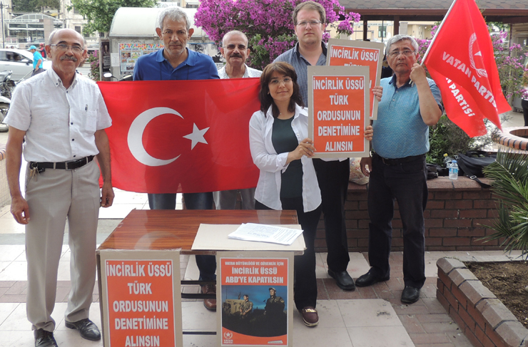 Vatan Partisi Hatay İl Örgütü, Antakya yer altı çarşısında imza masası açarak, Adana İncirlik Üssü’nün Amerika’ya kapatılarak, Türk Ordusunun emrine verilmesine yönelik imza kampanyası başlattı. Örgüt temsilcileri, imza kampanyasının İskenderun, Samandağ, Kırıkhan ve diğer ilçelerde süreceğini de duyurdular.