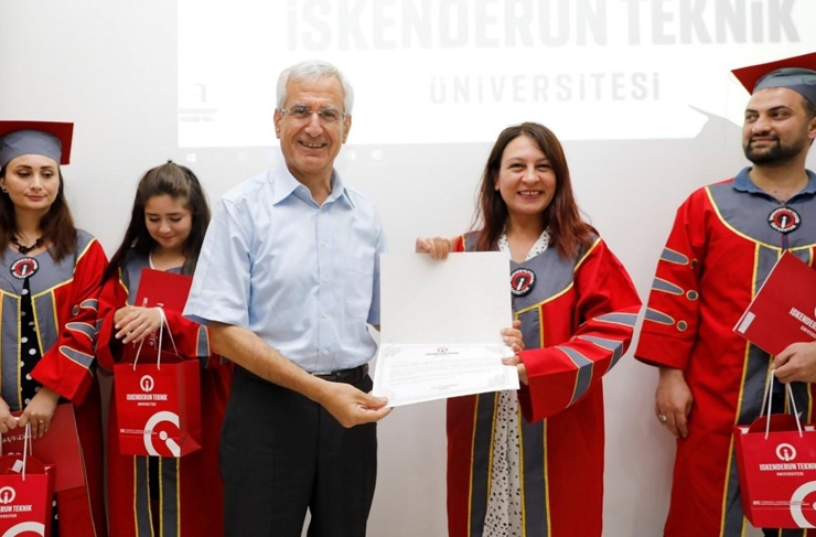 İSTE’de açılan İş Sağlığı Güvenliği (İSG) Tezsiz Yüksek Lisans Programını başarıyla bitiren, İskenderun Devlet Hastanesi hemşirelerinden Necla Aktuğ, diplomasını uzun yıllar beraber çalıştığı Arsuz Belediye Başkanı Dr. Asaf Güven’in elinden aldı.