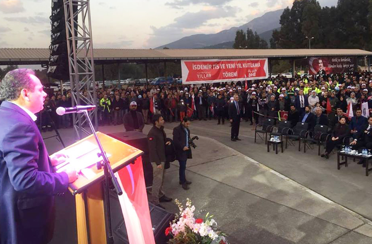Törenin açılış konuşmasını Çelik İş Genel Başkanı Yunus Değirmenci yaptı. Toplu İş Sözleşmesinin detaylarını açıklayan Değirmenci; “2017 Ocak ayına kadar horlandık, dışlandık, ötekileştirilerek, yok sayıldık. Hatta, yetkiyi alsak bile, toplu iş sözleşme masasına oturamayacağımız bile söylendi. Oysaki, bu işin muhatapları, bizler, sizler ve işveren tarafıydı. Ama bizler sustuk, işimize baktık. Yeni Türkiye’nin Yeni Çelik-İş’i olarak, yeni bir dönemi başlatarak, işçisiyle, işvereniyle, devletiyle, milletiyle, barışık bir sendikal yaşamı hayata geçirdik. Başımız önümüzde, hüsranla sözleşme masasından kalkacağımızın hayalini kuranlara, kavga edeceğimizi zannedip pusuda bekleyenlere, krizden beslenenlere, emek ve alın teri akıtmadan haybeden geçinenlere, kişisel menfaatleri için bu bölgede, huzursuzluk çıkmasını isteyenlere, klavye kahramanlığı yapanlara karşı, Elhamdülillah masa başında, el sıkışarak, imzaladığımız toplu iş sözleşmemiz, tokat gibi bir cevap olmuştur” dedi.