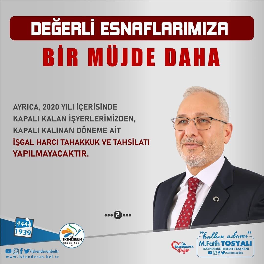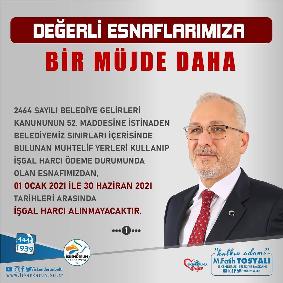 İskenderun Belediye Başkanı Fatih Tosyalı, ‘Belediye olarak her daim destekçisiyiz’ dediği esnaflarımız bir müjde daha verdi. Tosyalı, esnafımızdan 1 Ocak 2021 ile 30 Haziran 2021 tarihleri arasında İşgal Harcı alınmayacağını söyledi.
