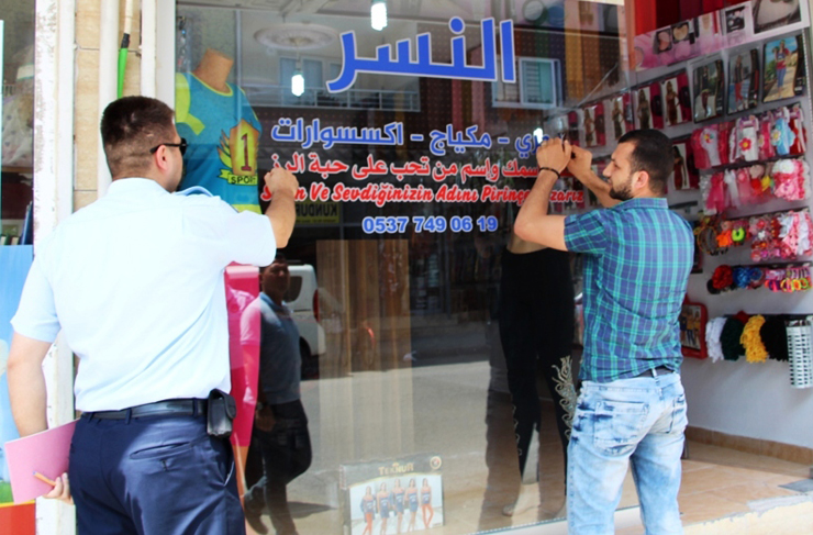 İskenderun Belediyesi Zabıta Müdürlüğü ekipleri, Suriyeli sığınmacıların açtığı iş yerlerindeki Arapça tabela ve yazıları kaldırmaya başladı.