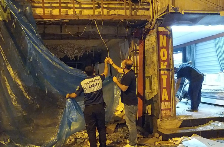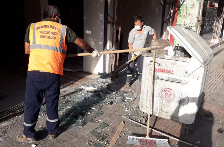 İskenderun Belediyesi ekipleri kentimizde dün gece gerçekleştirilen hain saldırı sonrasında yaşanan patlamadan zarar gören işyerlerinin ve evlerin olduğu bölgede temizlik çalışması yaptı.