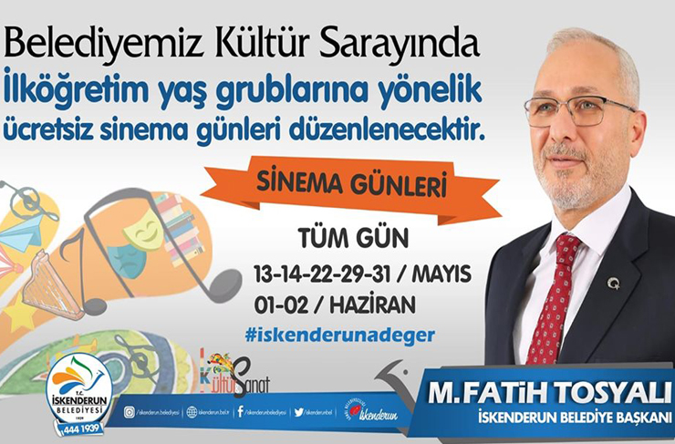 Düzenlenen ücretsiz sinema günleri hakkında bilgiler veren Belediye Başkanı Fatih Tosyalı; “Sosyal belediyecilik anlayışı çerçevesinde düzenleyeceğimiz öğrencilere yönelik ücretsiz sinema günlerini İskenderun İlçe Milli eğitim müdürlüğü ile programlayacağız. Haftanın belirli günlerinde ve saatlerinde düzenlenecek olan sinema günlerine öğrencilerimiz yoğun ilgi göstereceğine inanıyoruz. Bu konuda gerekli çalışmalar yapıldı.