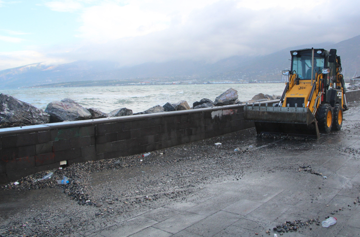 Fırtına sonrası belediye temizlik ekipleri sahil yolu başta olmak üzere fırtınanın yarattığı olumsuzlukları temizledi. İskenderun sahilinde fırtınanın oluşturduğu dalgaların sahil bandına getirdiği taş, kum ve çakıllar yoğun bir mesainin ardından temizlendi.