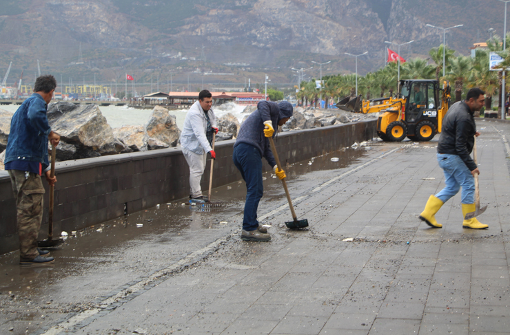 Fırtına sonrası belediye temizlik ekipleri sahil yolu başta olmak üzere fırtınanın yarattığı olumsuzlukları temizledi. İskenderun sahilinde fırtınanın oluşturduğu dalgaların sahil bandına getirdiği taş, kum ve çakıllar yoğun bir mesainin ardından temizlendi.