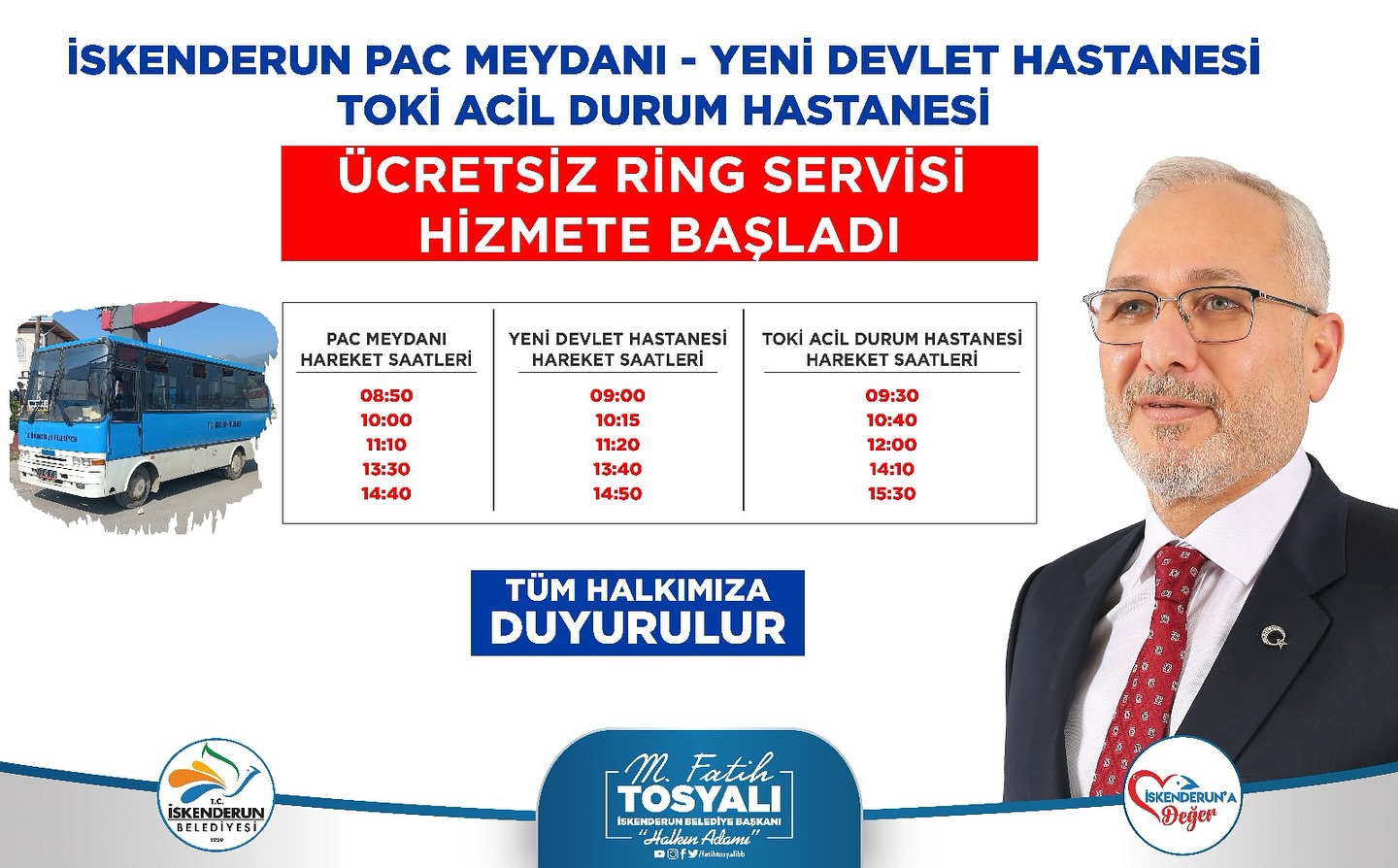 Konuyla ilgili değerlendirme yapan Başkan Tosyalı; “Kıymetli hemşerilerimiz için Pac Meydanı-Yeni Devlet Hastanesi-Acil Durum Hastanesi arasında ücretsiz Ring Servisi hizmetimiz başlamıştır. Ücretsiz Ring Servislerimiz 08.50-16.00 saatleri arasında 5 tur dönüşümlü olarak hareket edecektir” dedi. (Haber Merkezi)