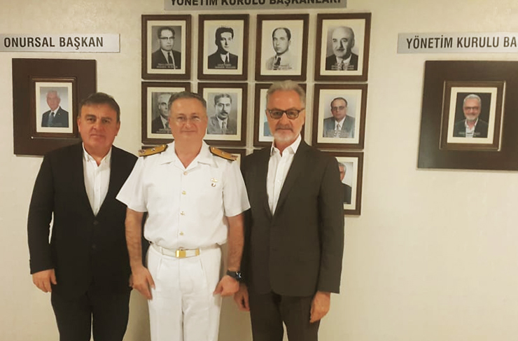 İskenderun Deniz Üs Komutanı Tuğamiral Fuat Gedik’in ziyaretinde, İTSO Başkanı Levent Hakkı Yılmaz, İTSO Meclis üyesi Bayram Alpagül yer aldı.