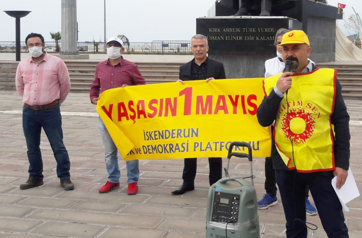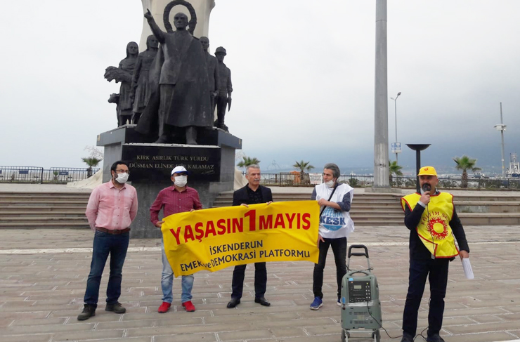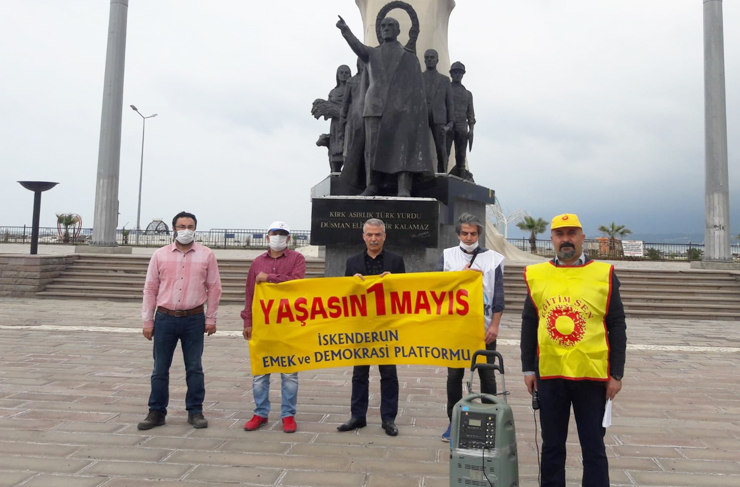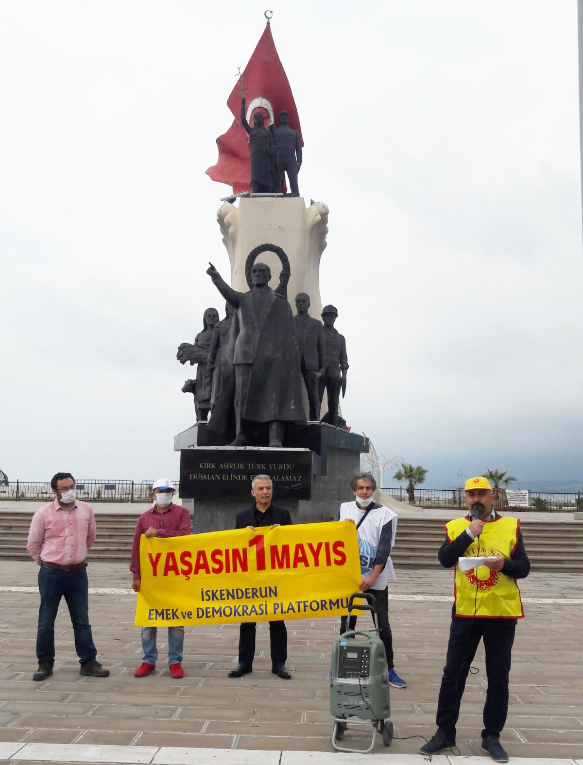İskenderun Emek ve Demokrasi Güçleri, 1 Mayıs Emek ve Dayanışma Günü dolayısıyla Atatürk Anıt Alanında, Covid-19 tedbirleri dolayısıyla az sayıda kişiyle bir araya geldi.