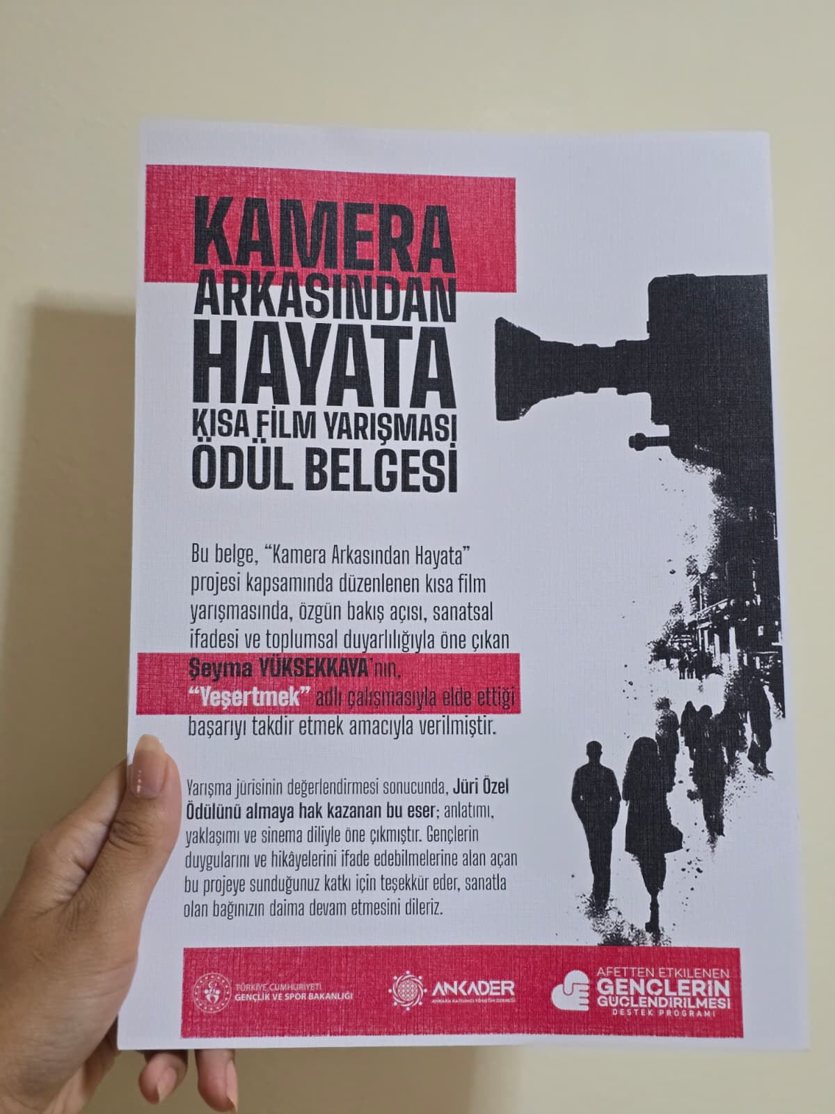 İskenderun Gençlik Merkezi eğitmenlerinden Şeyma Yüksekkaya, Gençlik ve Spor Bakanlığı ile Ankader iş birliğinde hayata geçirilen “Kamera Arkasından Hayata” kısa film projesi kapsamında yapılan yarışmada “Yeşertmek” adlı kısa filmi ile Ankara’da gerçekleşen ödül töreninde Jüri Özel Ödülüne layık görüldü.