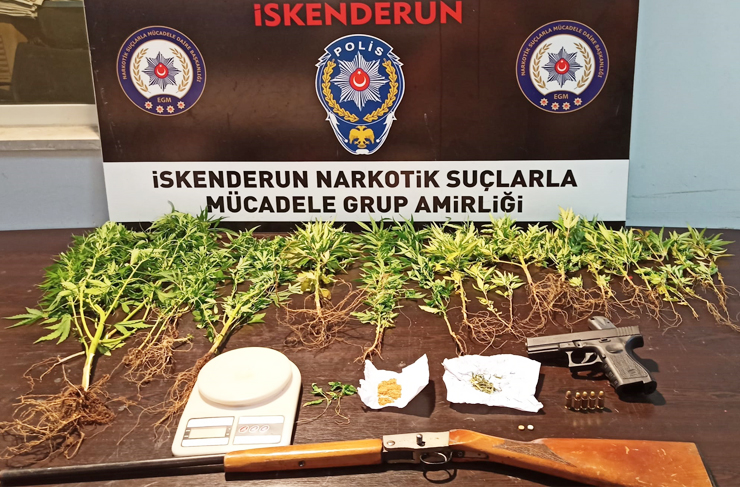 Ayrıca A.M.U. isimli şahsın ikamet adresinde yapılan aramada ise 2,35 gram Esrar, 2,32 gram Sentetik Kannabinoid, 2 adet Captagon hap, 3 adet saksılara ekilmiş, boyları 5 ile 10 cm arasında değişen Dişi Hint Keneviri bitkisi, 1 adet Av Tüfeği, 1 adet Tabanca, bu tabancaya ait 1 adet şarjör ve 4 adet fişek, ele geçirildi.