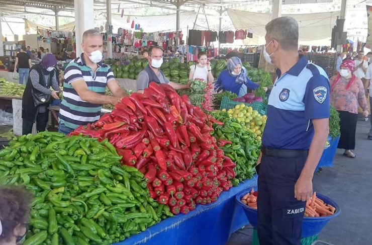 İskenderun’da semt pazarları giriş, çıkışlarında İskenderun zabıtası ekiplerince maske ve eldiven denetimleri devam ediyor. Zabıta ekipleri ayrıca, maskesiz olarak pazara gelenlere ücretsiz maske dağıtımı yapıyor.