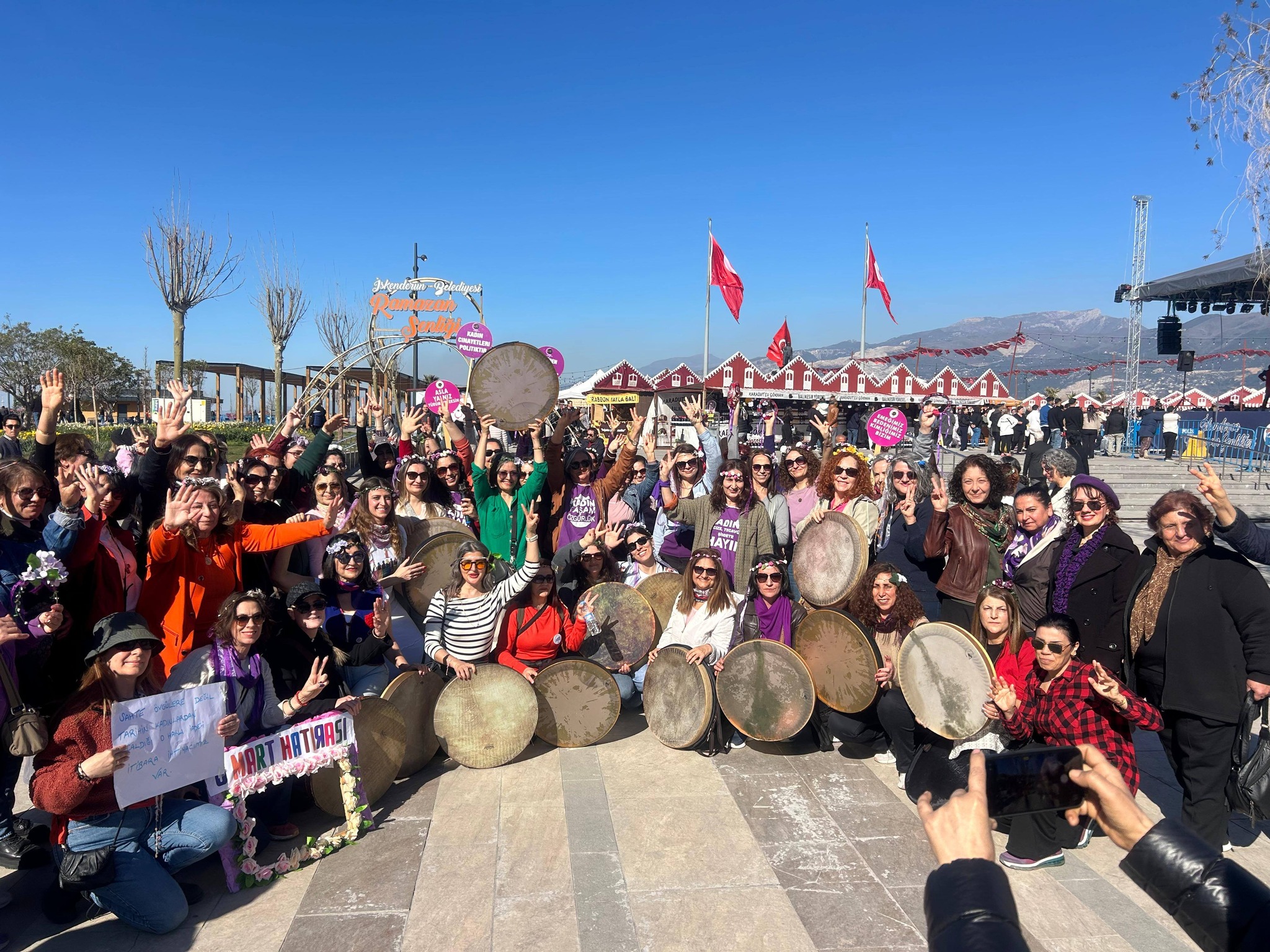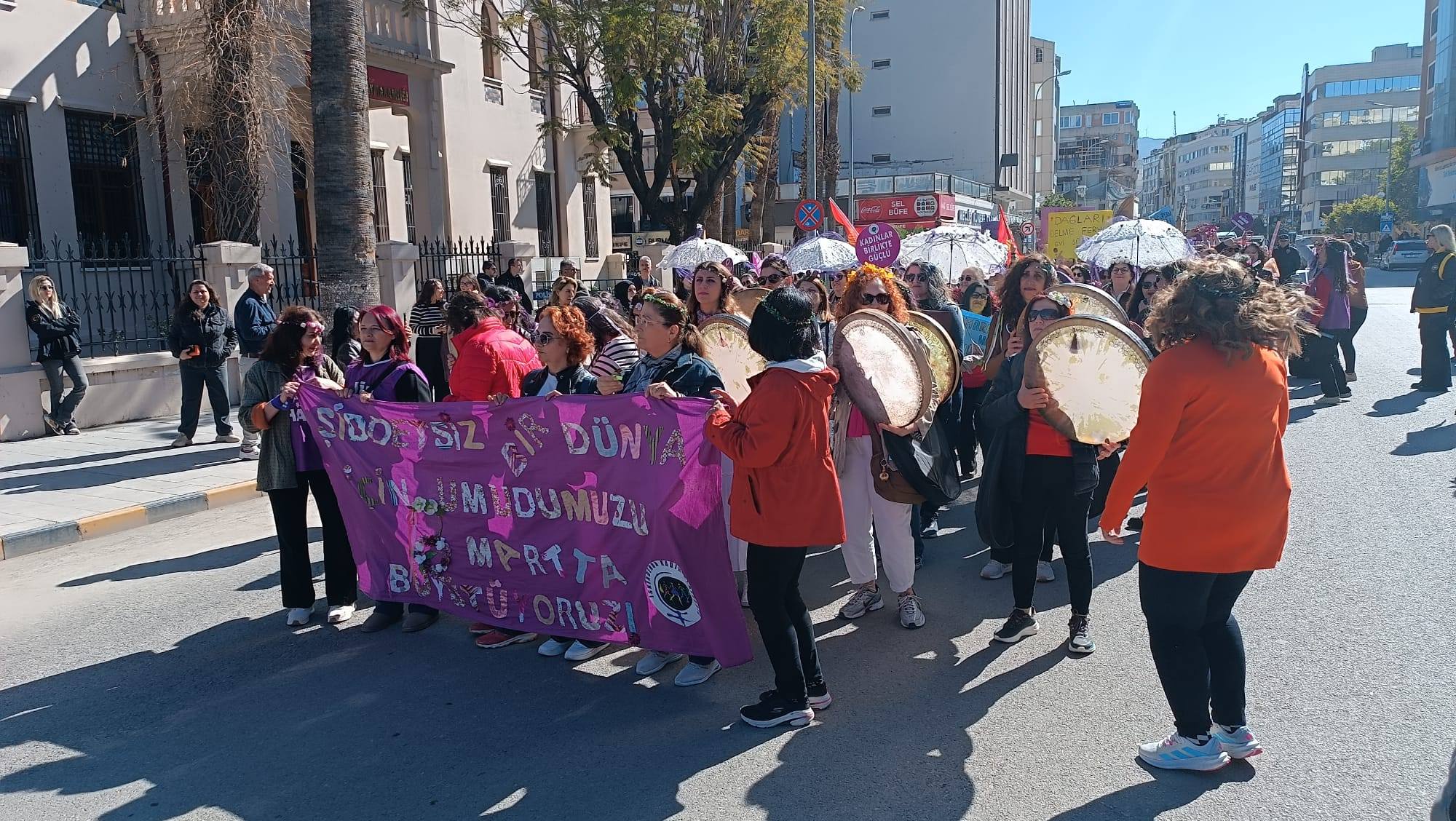Renkli kıyafetleri, taşıdıkları pankart ve dövizlerle yürüyüşe katılan kadınlar, attıkları sloganlar ve alkışlarla alanda dikkat çekici görüntüler oluşturdu. Etkinlikte Türkçe, Arapça ve Kürtçe şarkılar söylendi, halaylar çekildi.