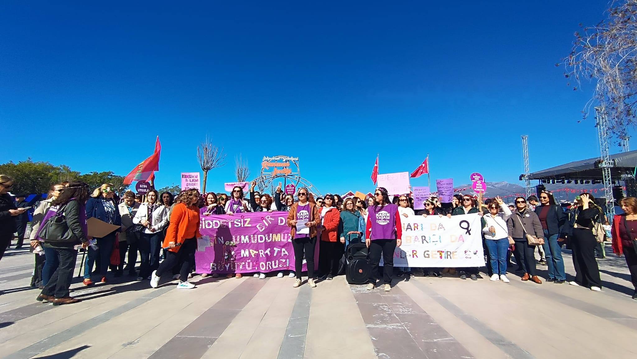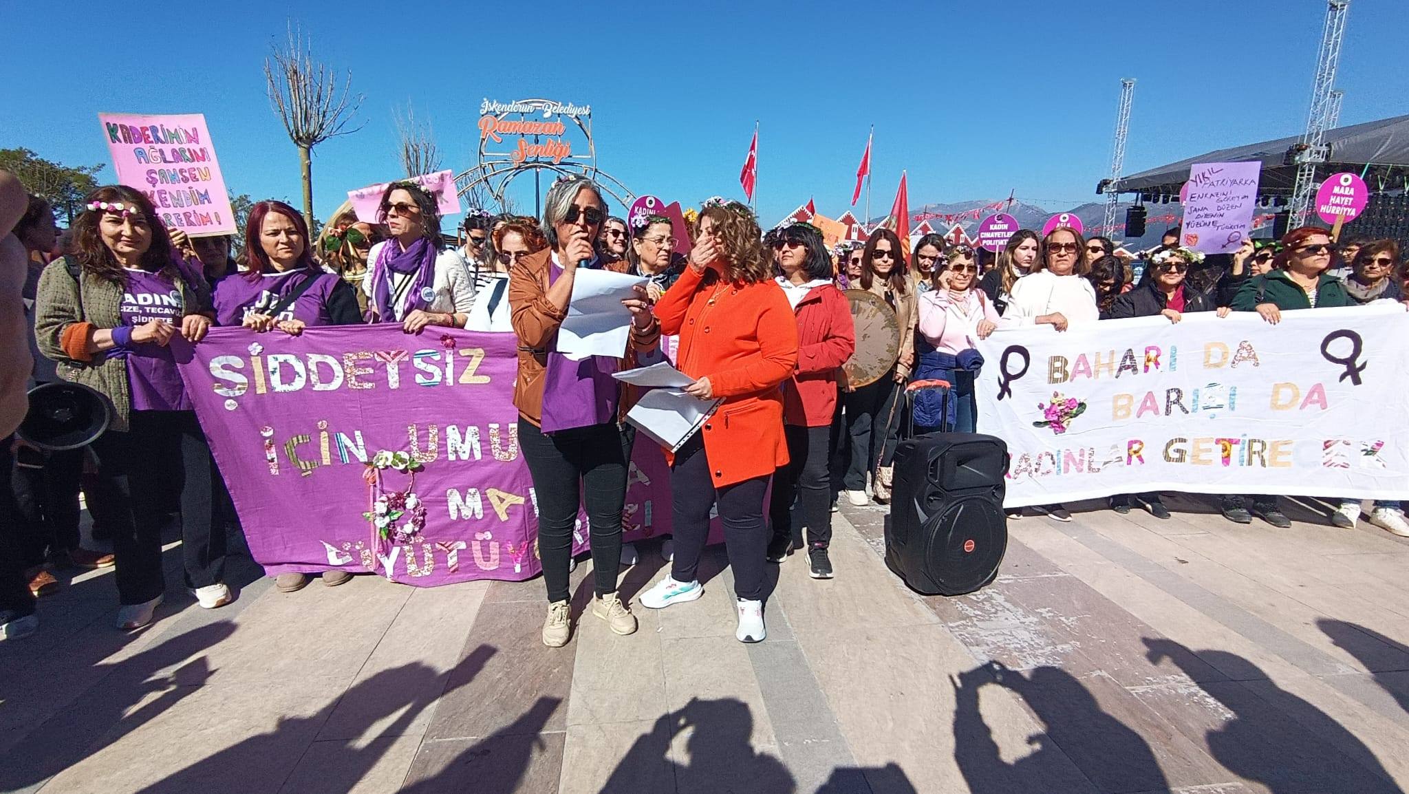 İskenderun Kadın Platformu, Dünya Emekçi Kadınlar Günü kapsamında Sağlıklı Yaşam Parkında etkinlik düzenledi. Etkinlik kapsamında kadınlar, Ulucami Caddesi, Havuzlu Çarşı ve Şehit Pamir Caddesi güzergâhını takip ederek yürüyüş korteji oluşturdu. Yol kenarından ilerleyen grup yürüyüşünü İskenderun Atatürk Anıtı önünde tamamladı.