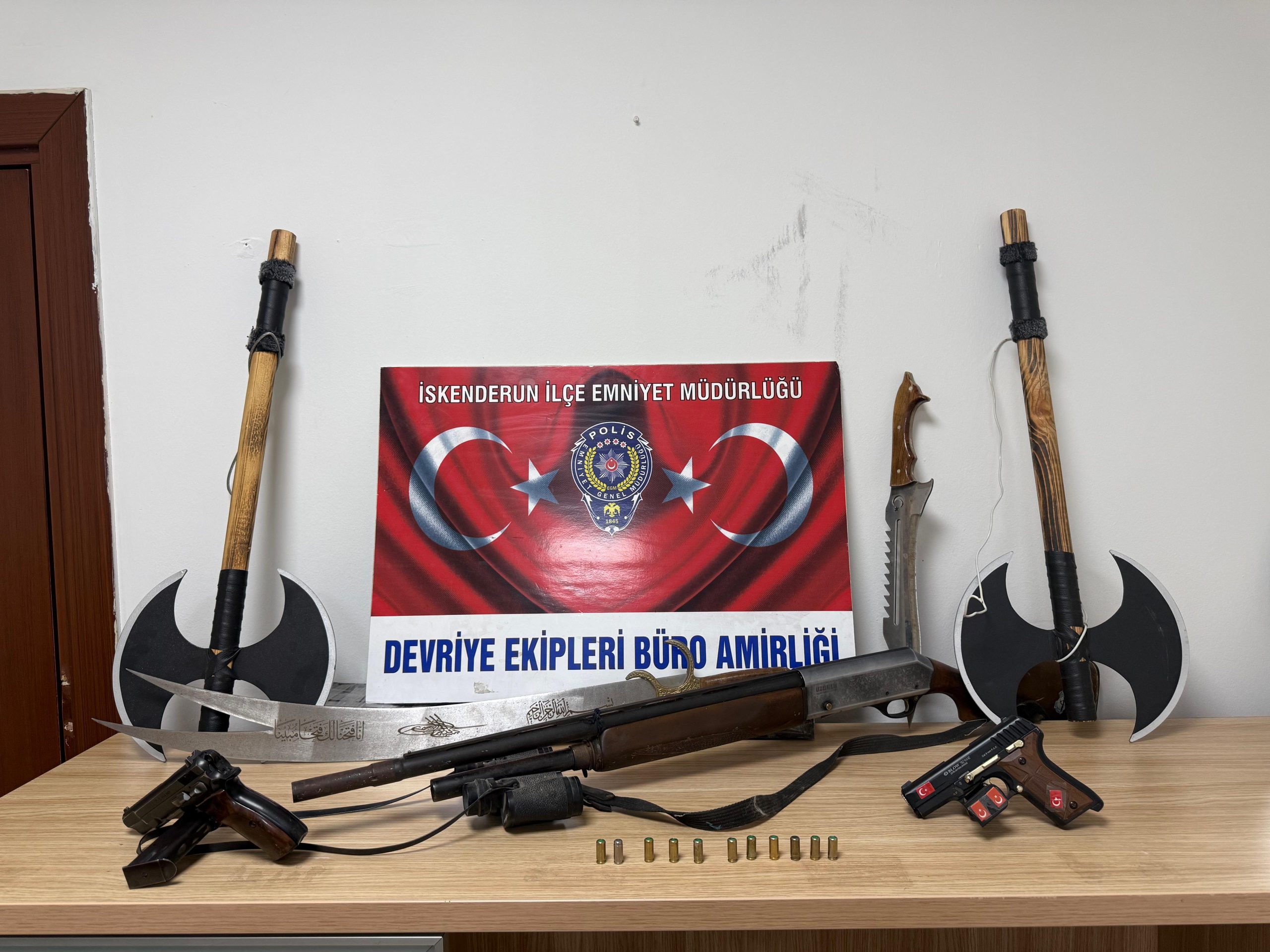 Emniyet Müdürlüğü ekiplerince İskenderun’da gerçekleştirilen çalışmada, bir ikametin balkonunda sergilenen silahlar dikkat çekti.