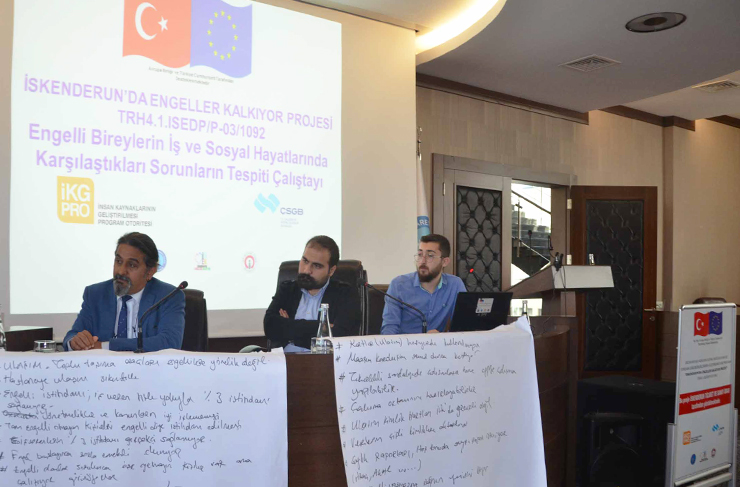 Dezavantajlı Kişilerin Sosyal Entegrasyonu ile İstihdam Edilebilirliklerinin Desteklenmesi Hibe Programı Kapsamında, İskenderun Ticaret ve Sanayi Odası’nın yürütücülüğünü üstlendiği, İskenderun Teknik Üniversitesi’nin ortak olduğu, ‘İskenderun’da Engeller Kalkıyor’ Projesinin Çalıştay’ında, engelli vatandaşlar, yaşadıkları sıkıntıları dile getirdiler. Sorunların görüşüldüğü ve çözüm önerilerinin ele alındığı toplantıda, Proje Koordinatörü Dilek Yalçın, Sine-vizyon destekli olarak projenin detayları hakkında bilgiler verdi.