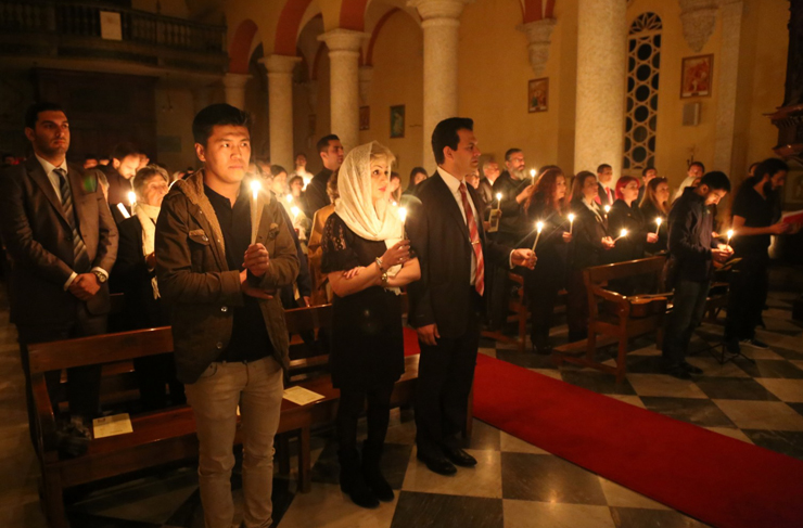 Karanlık olan kilise içerisine giren rahipler ve cemaat üyeleri ellerindeki mumlarla kiliseyi aydınlattılar. Kilise içerisinde devam eden ayinde, Paskalya’nın, tüm dünyaya barış getirmesi, insanları yanlış düşüncelerden, hastalıklardan, kötülüklerden, yanlışlıklardan uzaklaştırması, hastaları sağlığına kavuşturması, zor durumdaki mültecileri evlerine ulaştırması yönünde dualar edildi.