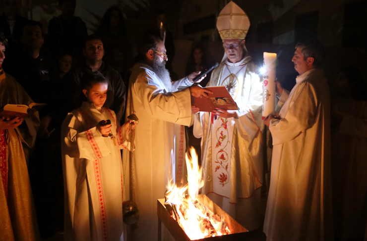 Karanlık olan kilise içerisine giren rahipler ve cemaat üyeleri ellerindeki mumlarla kiliseyi aydınlattılar. Kilise içerisinde devam eden ayinde, Paskalya’nın, tüm dünyaya barış getirmesi, insanları yanlış düşüncelerden, hastalıklardan, kötülüklerden, yanlışlıklardan uzaklaştırması, hastaları sağlığına kavuşturması, zor durumdaki mültecileri evlerine ulaştırması yönünde dualar edildi.
