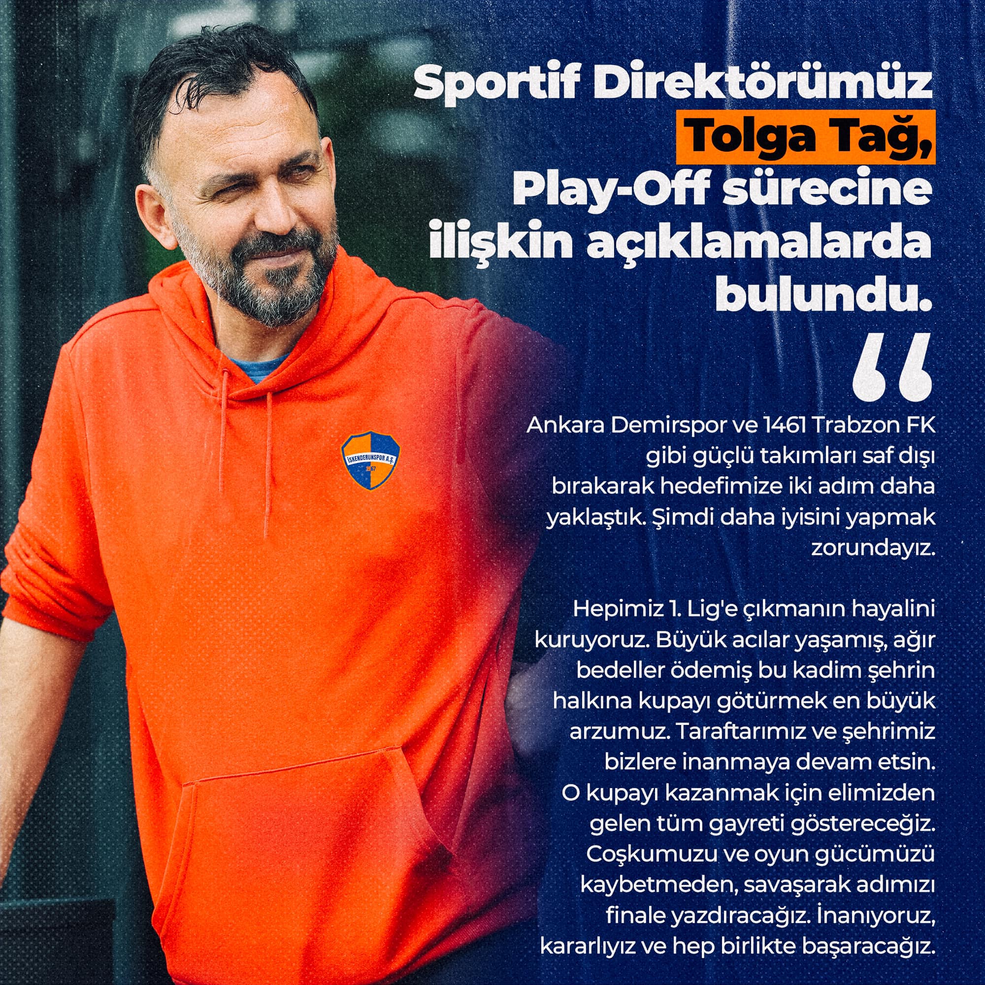 İskenderunspor Sportif Direktörü Tolga Tağ, zorlu Bucaspor maçı öncesinde play-off sürecine ilişkin açıklamalarda bulundu. Zor bir yolda olduklarına dikkat çeken Tolga Tağ; “Ankara Demirspor ve 1461 Trabzon FK gibi güçlü takımları saf dışı bırakarak hedefimize iki adım daha yaklaştık. Şimdi daha iyisini yapmak zorundayız. Hedefimiz olan 1. Lige çıkmanın hayalini kuruyoruz. Büyük acılar yaşamış, ağır bedeller ödemiş bu kadim şehrin halkına kupayı götürmek en büyük arzumuz. Taraftarımız ve şehrimiz bizlere inanmaya devam etsin. Bu kupayı kazanmak için elimizden gelen tüm gayreti göstereceğiz. Coşkumuzu ve oyun gücümüzü kaybetmeden, savaşarak adımızı finale yazdıracağız. İnanıyoruz, kararlıyız ve hep birlikte başaracağız” açıklamasında bulundu.